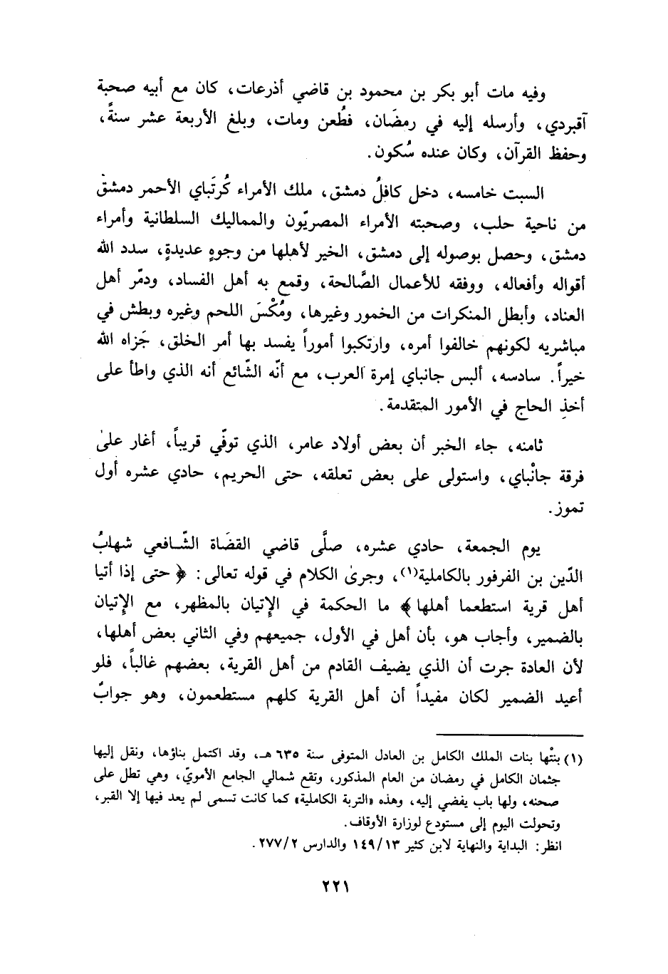 يَوْم الْجُمُعَة حادي عشره صلى قَاضِي الْقُضَاة الشَّافِعِي شهَاب الدّين بن الفرفور بالكاملية وَجرى الْكَلَام فِي قَوْله تَعَالَى {حَتَّى إِذا أَتَيَا أهل قَرْيَة استطعما أَهلهَا} مَا الْحِكْمَة فِي الاتيان بالمظهر مَعَ الاتيان بالضمير واجاب هُوَ بِأَن اهل فِي الاول جَمِيعهم وَفِي الثَّانِي بعض اهلها لَان الْعَادة جرت ان الَّذِي يضيف القادم من اهل الْقرْيَة بَعضهم غَالِبا فَلَو اعيد الضَّمِير لَكَانَ مُفِيدا ان اهل الْقرْيَة كلهم مستطعمون وَهُوَ جَوَاب