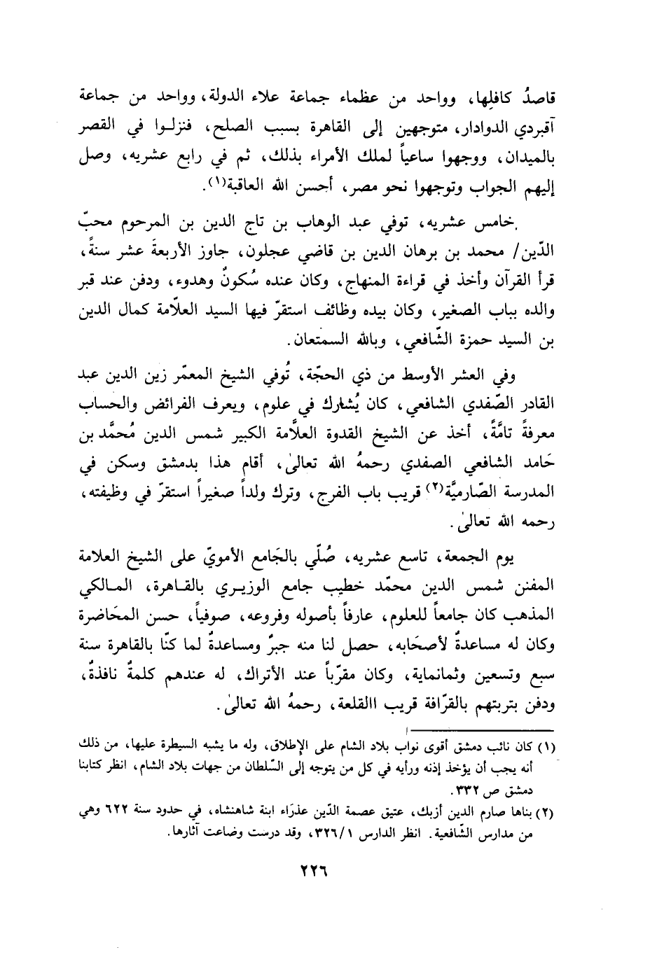 وَفِي الْعشْر الاوسط من ذِي الْحجَّة توفّي الشَّيْخ المعمر زين الدّين عبد الْقَادِر الصَّفَدِي الشَّافِعِي كَانَ يُشَارك فِي عُلُوم وَيعرف الْفَرَائِض والحساب معرفَة تَامَّة اخذ عَن الشَّيْخ الْقدْوَة الْعَلامَة الْكَبِير شمس الدّين مُحَمَّد بن حَامِد الشَّافِعِي الصَّفَدِي رَحمَه الله تَعَالَى اقام هَذَا بِدِمَشْق وَسكن فِي الْمدرسَة الصارمية قريب بَاب الْفرج وَترك ولدا صَغِيرا اسْتَقر فِي وظيفته رَحمَه الله تَعَالَى
