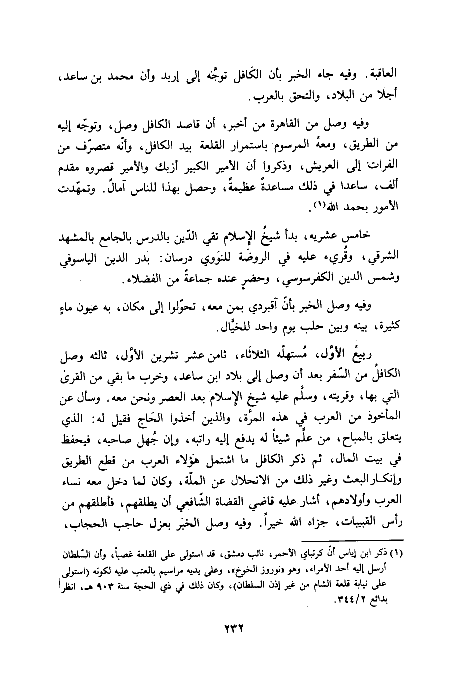 ربيع الاول مستهله الثُّلَاثَاء ثامن عشر تشرين الاول ثالثه وصل الكافل من السّفر بعد ان وصل إِلَى بِلَاد ابْن ساعد وَخرب مَا بَقِي من الْقرى الَّتِي بهَا وقريته وَسلم عَلَيْهِ شيخ الاسلام بعد الْعَصْر وَنحن مَعَه وَسَأَلَ عَن الْمَأْخُوذ من الْعَرَب فِي هَذِه الْمرة وَالَّذين اخذوا الْحَاج فَقيل لَهُ الَّذِي يتَعَلَّق بالمباح من علم شَيْئا لَهُ يدْفع اليه راتبه وان جهل صَاحبه فيحفظ فِي بَيت المَال ثمَّ ذكر الكافل مَا اشْتَمَل هَؤُلَاءِ الْعَرَب من قطع الطَّرِيق وانكار الْبَعْث وَغير ذَلِك من الانحلال عَن الْملَّة وَكَانَ لما دخل مَعَه نسَاء الْعَرَب واولادهم اشار عَلَيْهِ قَاضِي الْقُضَاة الشَّافِعِي ان يُطْلِقهُمْ فَأَطْلَقَهُمْ من رَأس القبيبات جزاه الله خيرا وَفِيه وصل الْخَبَر بعزل حَاجِب الْحجاب