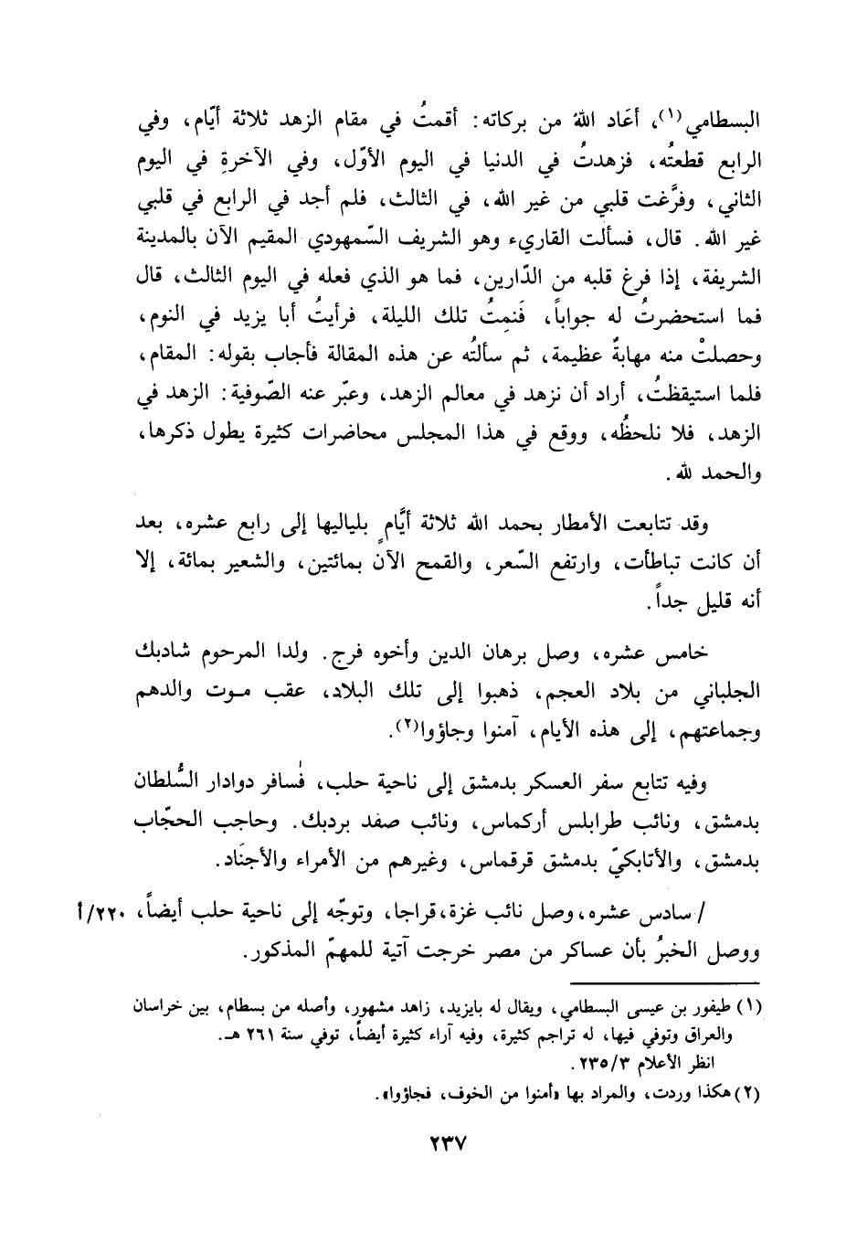البسطامي اعاد الله من بركاته اقمت فِي مقَام الزّهْد ثَلَاثَة ايام وَفِي الرَّابِع قطعته فزهدت فِي الدُّنْيَا فِي الْيَوْم الاول وَفِي الْآخِرَة فِي الْيَوْم الثَّانِي وفرغت قلبِي من غير الله فِي الثَّالِث فَلم اجد فِي الرَّابِع فِي قلبِي غير الله قَالَ فَسَأَلت القاريء وَهُوَ الشريف السمهودي الْمُقِيم الْآن بِالْمَدِينَةِ الشَّرِيفَة إِذا فرغ قلبه من الدَّاريْنِ فَمَا هُوَ الَّذِي فعله فِي الْيَوْم الثَّالِث قَالَ فَمَا استحضرت لَهُ جَوَابا فَنمت تِلْكَ اللَّيْلَة فَرَأَيْت ابا يزِيد فِي النّوم وحصلت مِنْهُ مهابة عَظِيمَة ثمَّ سَأَلته عَن هَذِه الْمقَالة فَأجَاب بقوله الْمقَام فَلَمَّا استيقظت اراد ان نزهد فِي معالم الزّهْد وَعبر عَنهُ الصُّوفِيَّة الزّهْد فِي الزّهْد فَلَا نلحظه وَوَقع فِي هَذَا الْمجْلس محاضرات كَثِيرَة يطول ذكرهَا وَالْحَمْد لله