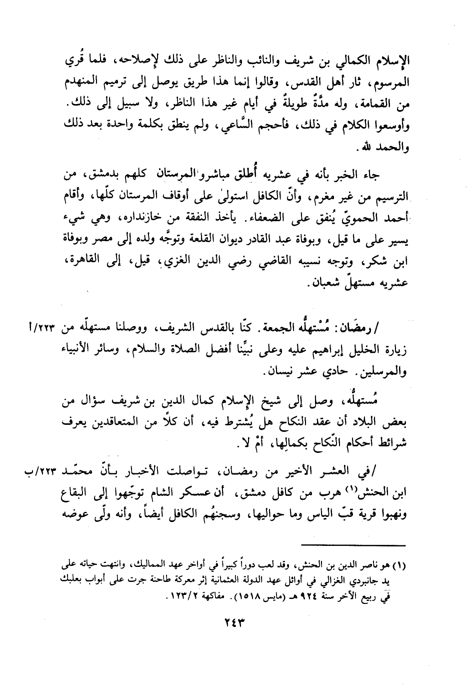 جَاءَ الْخَبَر بِأَنَّهُ فِي عشريه اطلق مباشرو المرستان كلهم بِدِمَشْق من الترسيم من غير مغرم وان الكافل استولى على اوقاف المرستان كلهَا واقام احْمَد الْحَمَوِيّ ينْفق على الضُّعَفَاء يَأْخُذ النَّفَقَة من خازنداره وَهِي شَيْء يسير على مَا قيل وبوفاة عبد الْقَادِر ديوَان القلعة وَتوجه وَلَده إِلَى مصر وبوفاة ابْن شكر وَتوجه نسيبه القَاضِي رَضِي الدّين الْغَزِّي قيل إِلَى الْقَاهِرَة عشريه مستهل شعْبَان