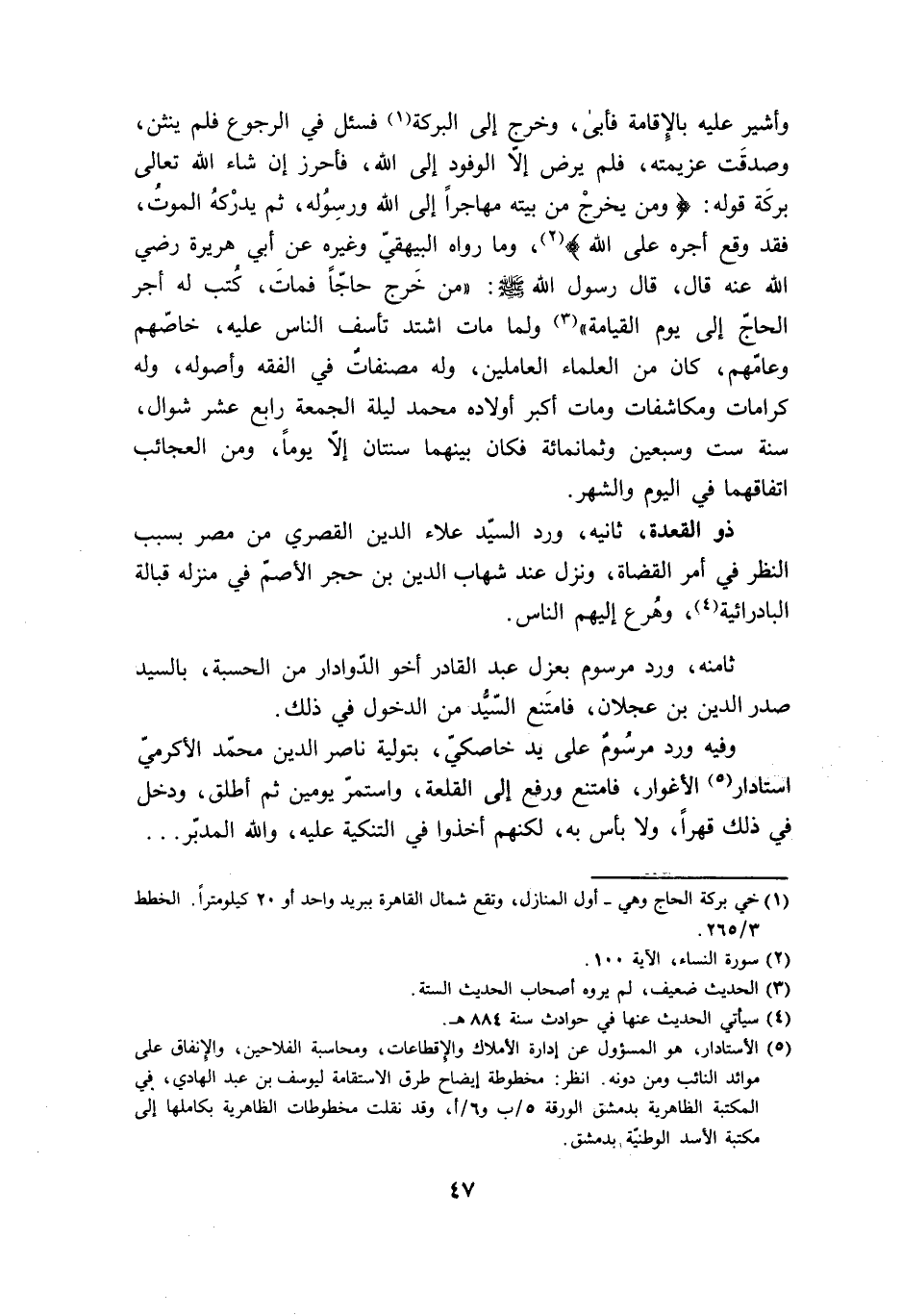 وأشير عَلَيْهِ بِالْإِقَامَةِ فَأبى وَخرج إِلَى الْبركَة فَسئلَ فِي الرُّجُوع فَلم ينثن وصدقت عزيمته فَلم يرض إِلَّا الْوُفُود إِلَى الله فأحرز إِن شَاءَ الله تَعَالَى بركَة قَوْله {وَمن يخرج من بَيته مُهَاجرا إِلَى الله وَرَسُوله} ثمَّ يُدْرِكهُ الْمَوْت {فقد وَقع أجره على الله} وَمَا رَوَاهُ الْبَيْهَقِيّ وَغَيره عَن أبي هُرَيْرَة رَضِي الله عَنهُ قَالَ