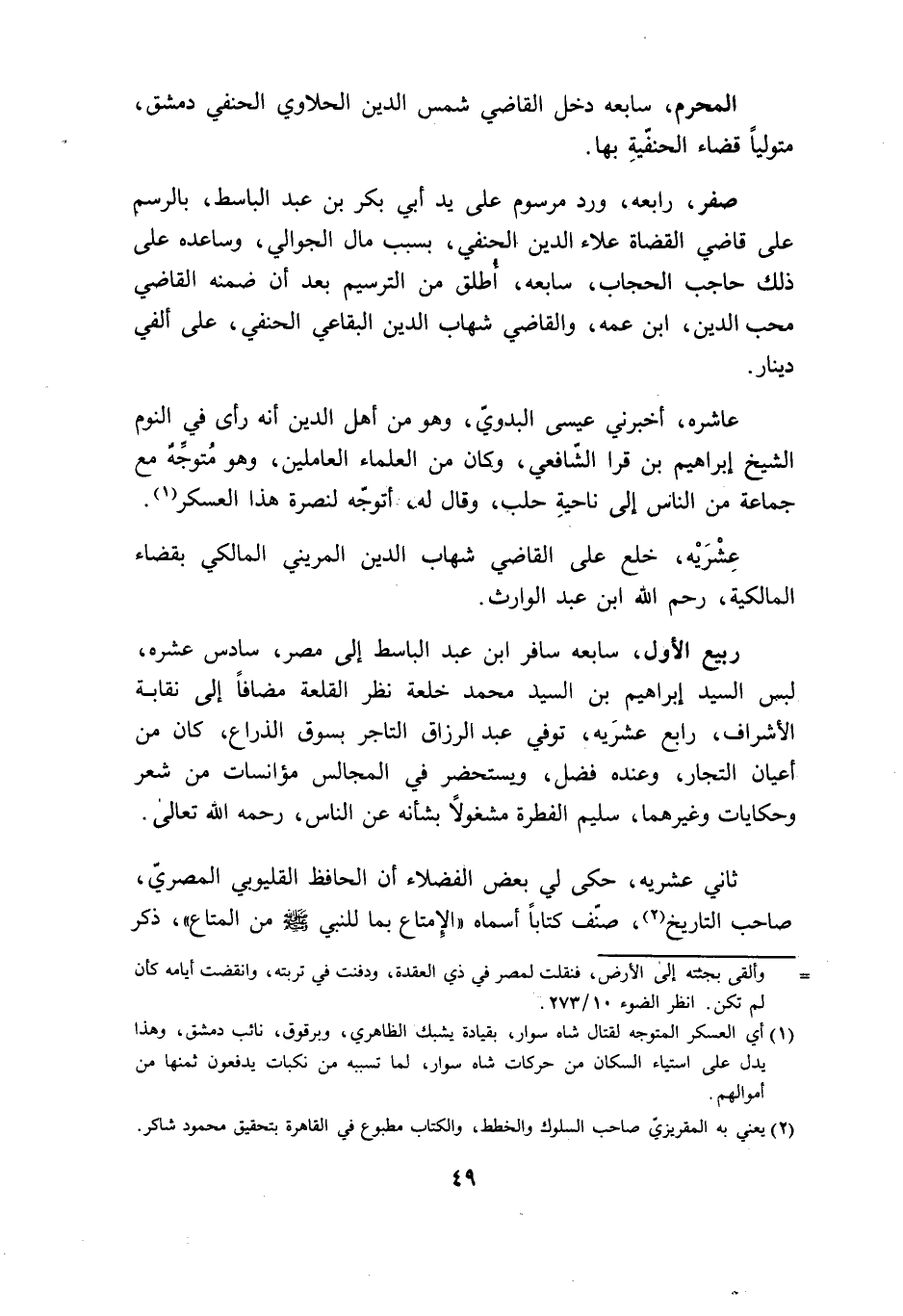 الْمحرم سابعه دخل القَاضِي شمس الدّين الحلاوي الْحَنَفِيّ دمشق مُتَوَلِّيًا قَضَاء الْحَنَفِيَّة بهَا