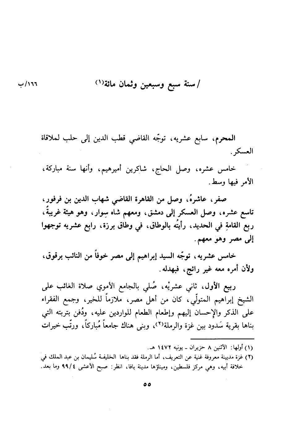 ربيع الأول ثَانِي عشريه صلي بالجامع الْأمَوِي صَلَاة الْغَائِب على الشَّيْخ إِبْرَاهِيم الْمُتَوَلِي كَانَ من أهل مصر ملازما للخير وَجمع الْفُقَرَاء على الذّكر وَالْإِحْسَان إِلَيْهِم وإطعام الطَّعَام للواردين عَلَيْهِ وَدفن بتربته الَّتِي بناها بقرية سدود بَين غَزَّة والرملة وَبنى هُنَاكَ جَامعا مُبَارَكًا ورتب خيرات