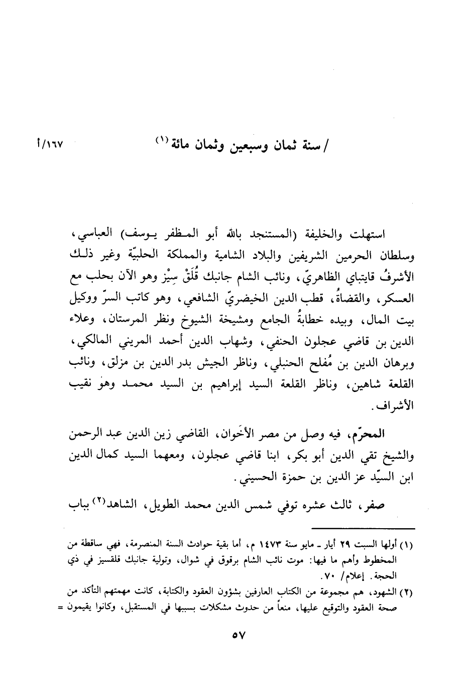 سنة ثَمَان وَسبعين وثمان مائَة إستهلت والخليفة المستنجد بِاللَّه أَبُو المظفر يُوسُف العباسي وسلطان الْحَرَمَيْنِ الشريفين والبلاد الشامية والمملكة الحلبية وَغير ذَلِك الْأَشْرَف قايتباي الظَّاهِرِيّ ونائب الشَّام جَانِبك قلق سيز وَهُوَ الْآن بحلب مَعَ الْعَسْكَر والقضاة قطب الدّين الخيضري الشَّافِعِي وَهُوَ كَاتب السِّرّ ووكيل بَيت المَال وَبِيَدِهِ خطابة الْجَامِع ومشيخة الشُّيُوخ وَنظر المرستان وعلاء الدّين بن قَاضِي عجلون الْحَنَفِيّ وشهاب الدّين أَحْمد المريني الْمَالِكِي وبرهان الدّين بن مُفْلِح الْحَنْبَلِيّ وناظر الْجَيْش بدر الدّين بن مزلق ونائب القلعة شاهين وناظر القلعة السَّيِّد إِبْرَاهِيم بن السَّيِّد مُحَمَّد وَهُوَ نقيب الْأَشْرَاف