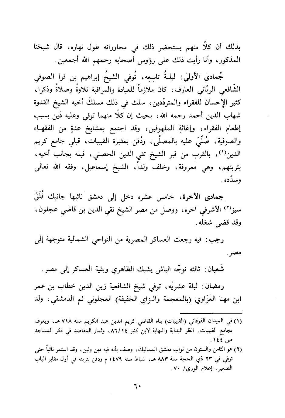 جُمَادَى الأولى لَيْلَة تاسعه توفّي الشَّيْخ إِبْرَاهِيم بن قرا الصُّوفِي الشَّافِعِي الرباني الْعَارِف كَانَ ملازما لِلْعِبَادَةِ والمراقبة تِلَاوَة وَصَلَاة وذكرا كثير الْإِحْسَان للْفُقَرَاء والمترددين سلك فِي ذَلِك مَسْلَك أَخِيه الشَّيْخ الْقدْوَة شهَاب الدّين أَحْمد رَحمَه الله بِحَيْثُ إِن كلا مِنْهُمَا توفّي وَعَلِيهِ دين بِسَبَب إطْعَام الْفُقَرَاء وإغاثة الملهوفين وَقد إجتمع بمشايخ عدَّة من الْفُقَهَاء والصوفية صلي عَلَيْهِ بالمصلى وَدفن بمقبرة القبيبات قبلي جَامع كريم الدّين بِالْقربِ من قبر الشَّيْخ تَقِيّ الدّين الحصني قبله بِجَانِب أَخِيه بتربتهم وَهِي مَعْرُوفَة وَخلف ولدا الشَّيْخ إِسْمَاعِيل وَفقه الله تَعَالَى وسدده