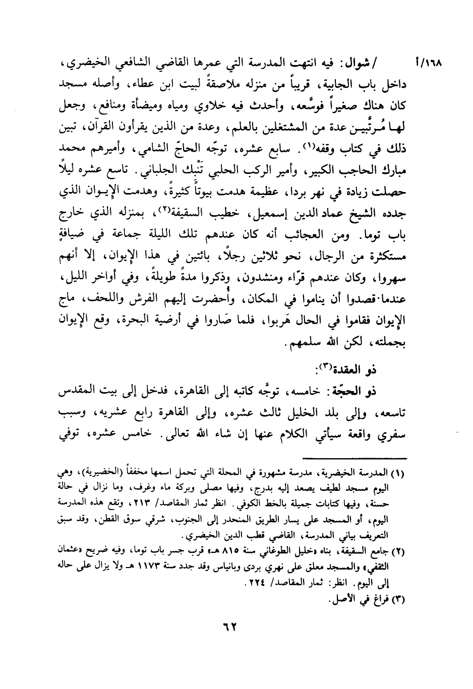 شَوَّال فِيهِ إنتهت الْمدرسَة الَّتِي عمرها القَاضِي الشَّافِعِي الخيضري دَاخل بَاب الْجَابِيَة قَرِيبا من منزله ملاصقة لبيت ابْن عَطاء وَأَصله مَسْجِد كَانَ هُنَاكَ صَغِيرا فوسعه وأحدث فِيهِ خلاوي ومياه وميضأة وَمَنَافع وَجعل لَهَا مرتبين عدَّة من المشتغلين بِالْعلمِ وعدة من الَّذين يقرأون الْقُرْآن تبين ذَلِك فِي = كتاب وَقفه سَابِع عشره توجه الْحَاج الشَّامي وأميرهم مُحَمَّد مبارك الْحَاجِب الْكَبِير وأمير الركب الْحلَبِي تنبك الجلباني تَاسِع عشره لَيْلًا حصلت زِيَادَة فِي نهر بردا عَظِيمَة هدمت بُيُوتًا كَثِيرَة وهدمت الإيوان الَّذِي جدده الشَّيْخ عماد الدّين إِسْمَاعِيل خطيب السَّقِيفَة بمنزله الَّذِي خَارج بَاب توما وَمن الْعَجَائِب أَنه كَانَ عِنْدهم تِلْكَ اللَّيْلَة جمَاعَة فِي ضِيَافَة مستكثرة من الرِّجَال نَحْو ثَلَاثِينَ رجلا بائتين فِي هَذَا الإيوان إِلَّا أَنهم سهروا وَكَانَ عِنْدهم قراء ومنشدون وَذكروا مُدَّة طَوِيلَة وَفِي أَوَاخِر اللَّيْل عِنْدَمَا قصدُوا أَن يَنَامُوا فِي الْمَكَان وأحضرت إِلَيْهِم الْفرش واللحف ماج الإيوان فَقَامُوا فِي الْحَال هربوا فَلَمَّا صَارُوا فِي أرضية البحرة وَقع الإيوان بجملته لَكِن الله سلمهم