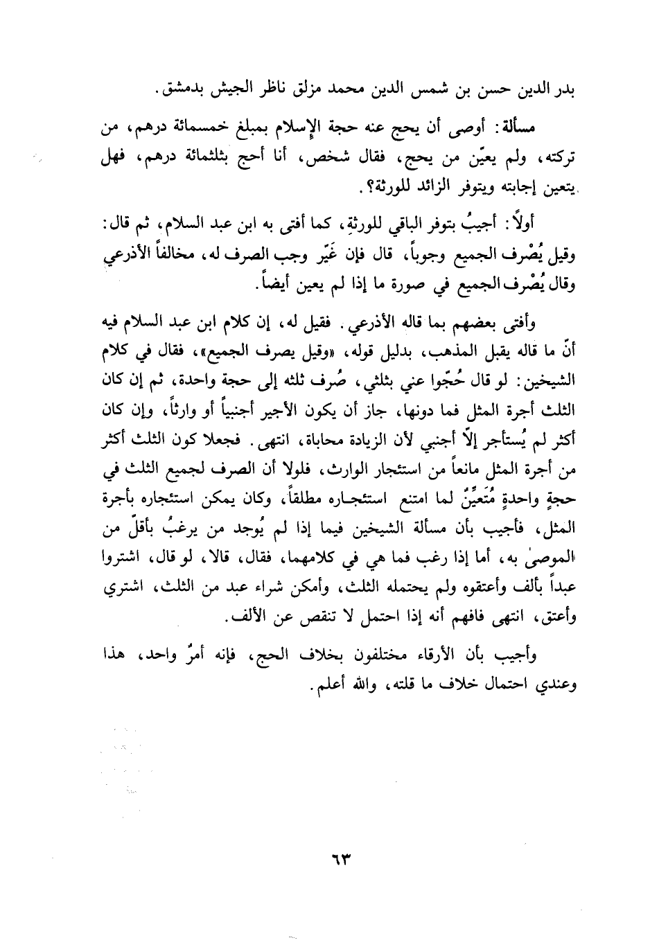وَأفْتى بَعضهم بِمَا قَالَه الْأَذْرَعِيّ فَقيل لَهُ إِن كَلَام ابْن عبد السَّلَام فِيهِ أَن مَا قَالَه يقبل الْمَذْهَب بِدَلِيل قَوْله وَقيل يصرف الْجَمِيع فَقَالَ فِي كَلَام الشَّيْخَيْنِ لَو قَالَ حجُّوا عني بِثُلثي صرف ثلثه إِلَى حجَّة وَاحِدَة ثمَّ إِن كَانَ الثُّلُث أُجْرَة الْمثل فَمَا دونهَا جَازَ أَن يكون الْأَجِير أَجْنَبِيّا أَو وَارِثا وَإِن كَانَ أَكثر لم يسْتَأْجر إِلَّا أَجْنَبِي لِأَن الزِّيَادَة مُحَابَاة إنتهى فَجعلَا كَون الثُّلُث أَكثر من أُجْرَة الْمثل مَانِعا من إستئجار الْوَارِث فلولا أَن الصّرْف لجَمِيع الثُّلُث فِي حجَّة وَاحِدَة مُتَعَيّن لما إمتنع إستئجاره مُطلقًا وَكَانَ يُمكن إستئجاره بِأُجْرَة الْمثل فَأُجِيب بِأَن مَسْأَلَة الشَّيْخَيْنِ فِيمَا إِذا لم يُوجد من يرغب بِأَقَلّ من الْمُوصى بِهِ أما إِذا رغب فَمَا هِيَ فِي كَلَامهمَا فَقَالَ قَالَا لَو قَالَ إشتروا عبدا بِأَلف وأعتقوه وَلم يحْتَملهُ الثُّلُث وَأمكن شِرَاء عبد من الثُّلُث اشْترِي وَأعْتق إنتهى فأفهم أَنه إِذا إحتمل لَا تنقص عَن الْألف