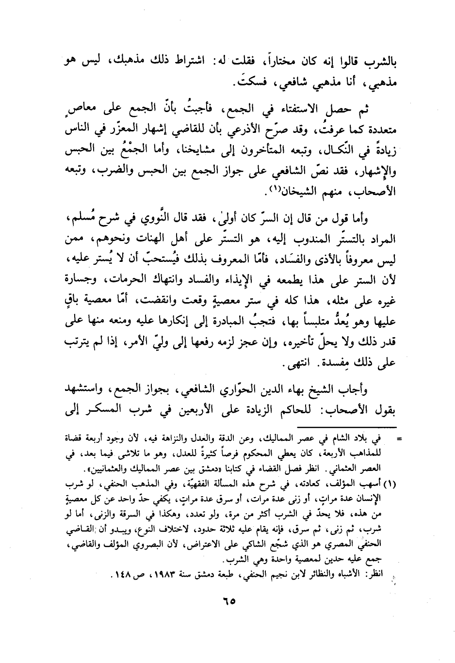 وَأجَاب الشَّيْخ بهاء الدّين الْحوَاري الشَّافِعِي بِجَوَاز الْجمع وإستشهد بقول الْأَصْحَاب للْحَاكِم الزِّيَادَة على الْأَرْبَعين فِي شرب الْمُسكر إِلَى