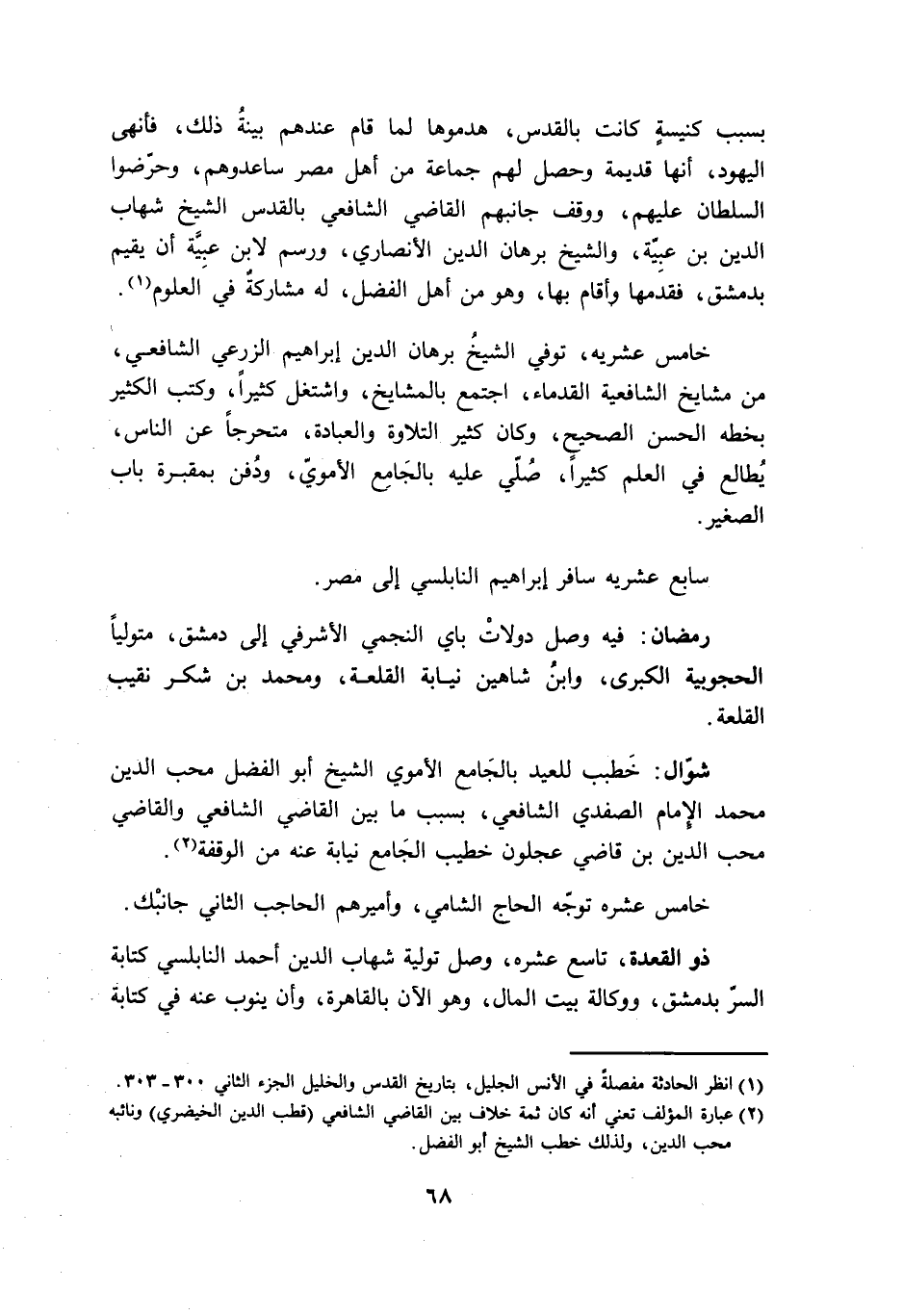 ذُو الْقعدَة تَاسِع عشره وصل تَوْلِيَة شهَاب الدّين أَحْمد النابلسي كِتَابَة السِّرّ بِدِمَشْق ووكالة بَيت المَال وَهُوَ الْآن بِالْقَاهِرَةِ وَأَن يَنُوب عَنهُ فِي كِتَابَة