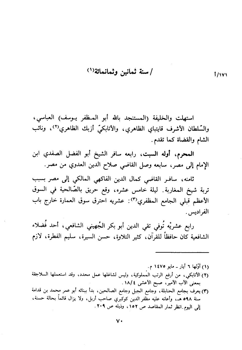 الْمحرم أَوله السبت رابعه سَافر الشَّيْخ أَبُو الْفضل الصَّفَدِي ابْن الإِمَام إِلَى مصر سابعه وصل القَاضِي صَلَاح الدّين الْعَدوي من مصر