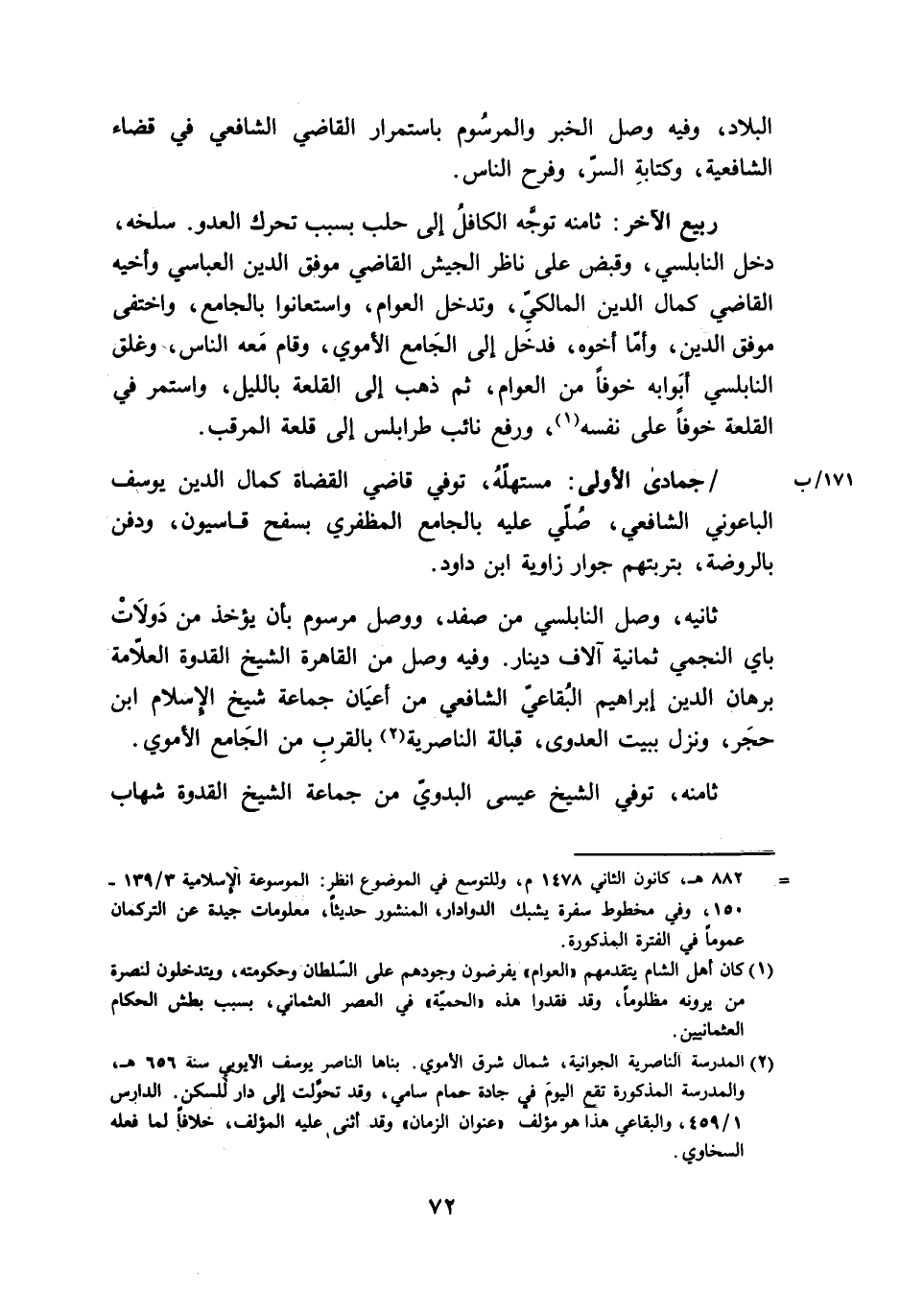 ربيع الآخر ثامنه توجه الكافل إِلَى حلب بِسَبَب تحرّك الْعَدو سلخه دخل النابلسي وَقبض على نَاظر الْجَيْش القَاضِي موفق الدّين العباسي وأخيه القَاضِي كَمَال الدّين الْمَالِكِي وَتدْخل الْعَوام واستعانوا بالجامع واختفى موفق الدّين وَأما أَخُوهُ فَدخل إِلَى الْجَامِع الْأمَوِي وَقَامَ مَعَه النَّاس وغلق النابلسي أبوابه خوفًا من الْعَوام ثمَّ ذهب إِلَى القلعة بِاللَّيْلِ وَاسْتمرّ فِي القلعة خوفًا على نَفسه وَرفع نَائِب طرابلس إِلَى قلعة المرقب