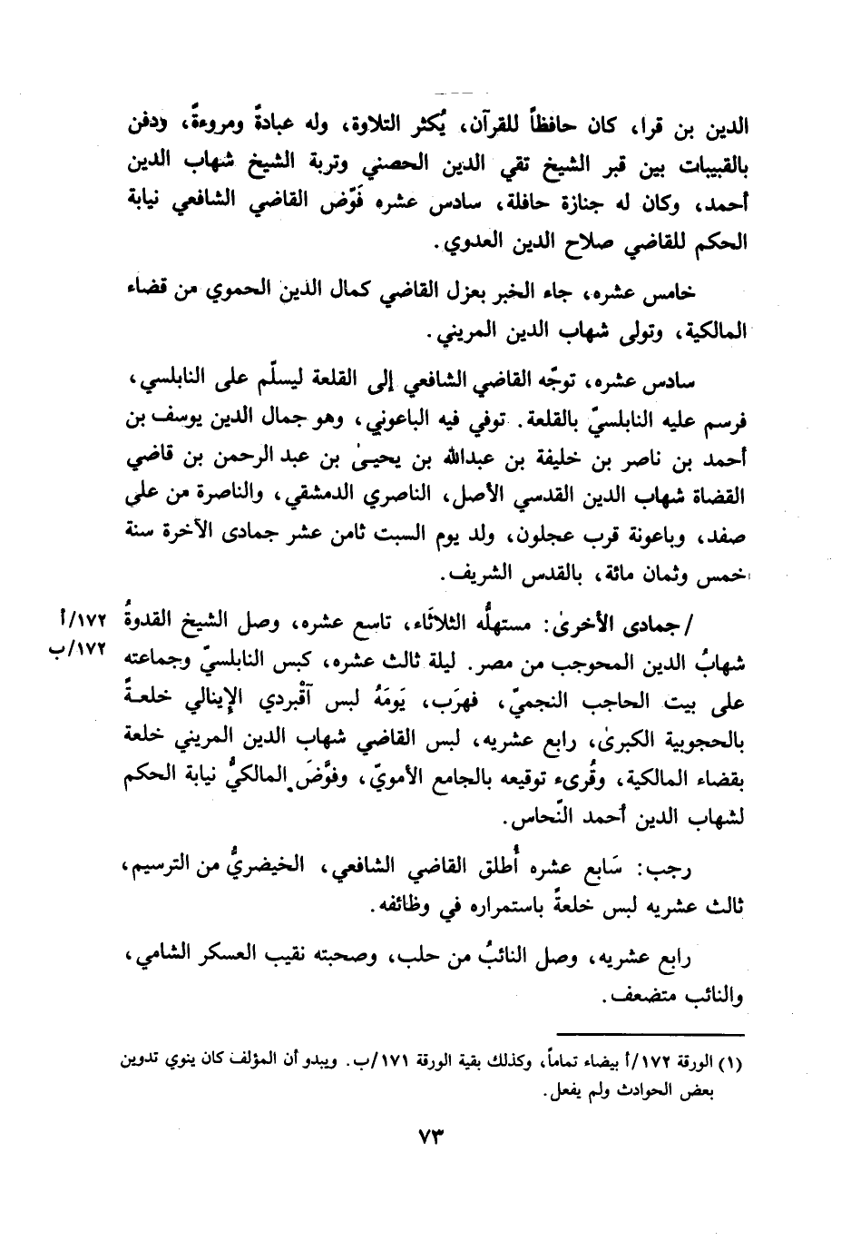 جُمَادَى الْأُخْرَى مستهله الثُّلَاثَاء تَاسِع عشره وصل الشَّيْخ الْقدْوَة شهَاب الدّين المحوجب من مصر لَيْلَة ثَالِث عشره كبس النابلسي وجماعته على بَيت الْحَاجِب النجمي فهرب يَوْمه لبس آقبردي الإينالي خلعة بالحجوبية الْكُبْرَى رَابِع عشريه لبس القَاضِي شهَاب الدّين المريني خلعة بِقَضَاء الْمَالِكِيَّة وَقُرِئَ توقيعه بالجامع الْأمَوِي وفوض الْمَالِكِي نِيَابَة الحكم لشهاب الدّين أَحْمد النّحاس