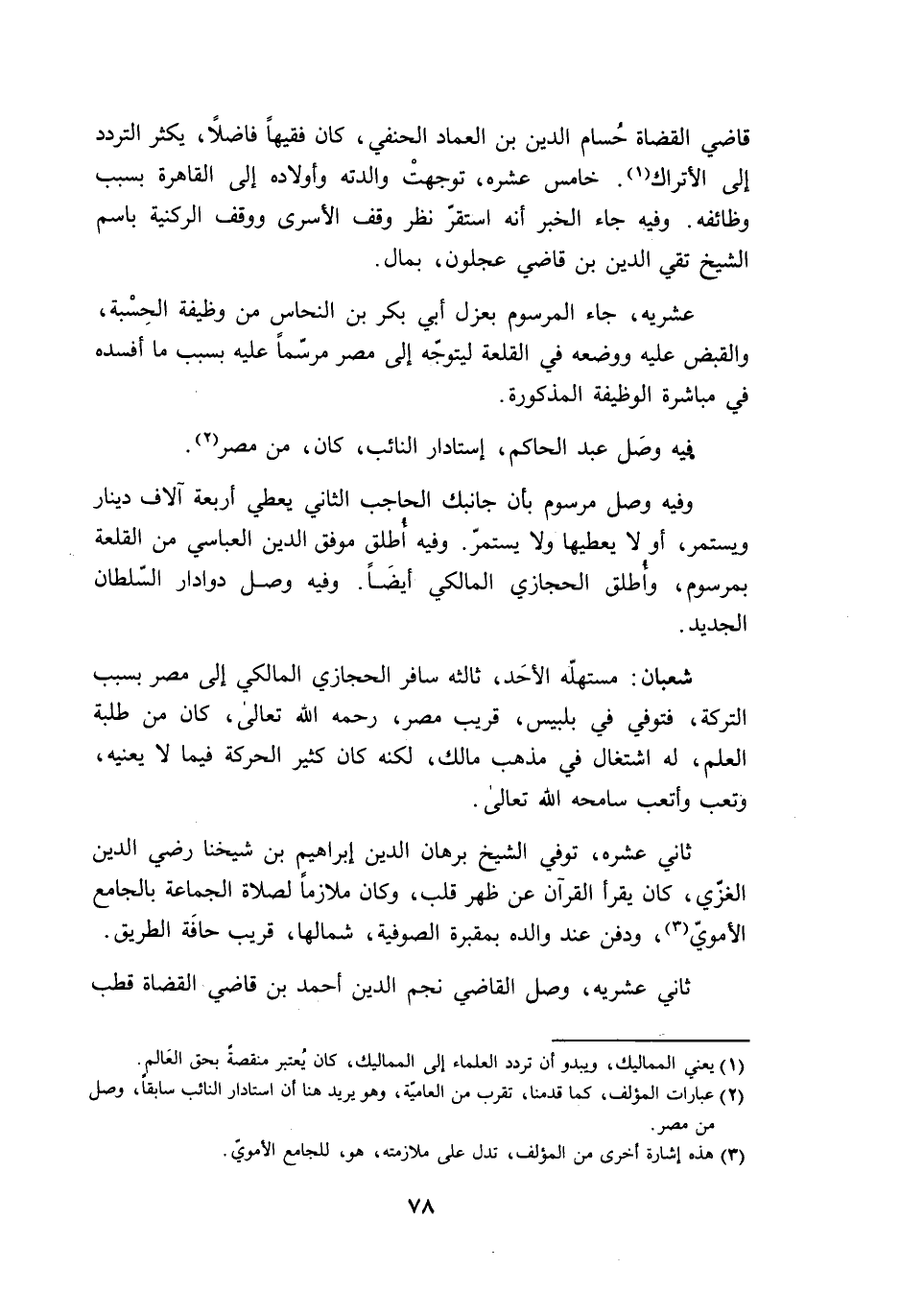 قَاضِي الْقُضَاة حسام الدّين بن الْعِمَاد الْحَنَفِيّ كَانَ فَقِيها فَاضلا يكثر التَّرَدُّد إِلَى الأتراك خَامِس عشره تَوَجَّهت والدته وَأَوْلَاده إِلَى الْقَاهِرَة بِسَبَب وظائفه وَفِيه جَاءَ الْخَبَر أَنه إستقر نظر وقف الأسرى ووقف الركنية باسم الشَّيْخ تَقِيّ الدّين بن قَاضِي عجلون بِمَال