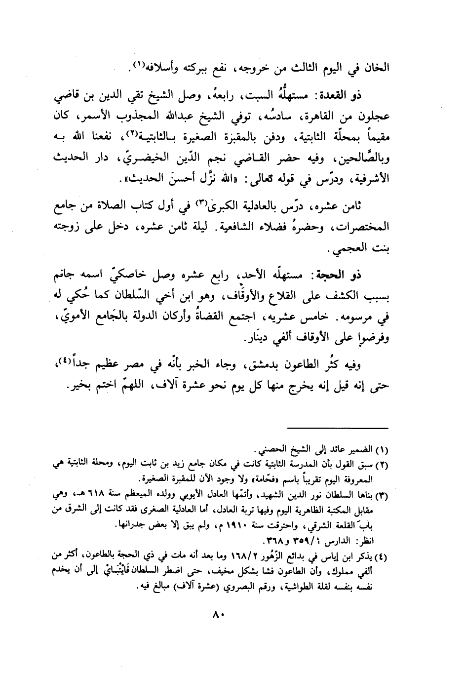 ذُو الْقعدَة مستهلة السبت رابعه وصل الشَّيْخ تَقِيّ الدّين بن قَاضِي عجلون من الْقَاهِرَة سادسه توفّي الشَّيْخ عبد الله المجذوب الأسمر كَانَ مُقيما بمحلة الثابتية وَدفن بالمقبرة الصَّغِيرَة بالثابتية نفعنا الله بِهِ وبالصالحين وَفِيه حضر القَاضِي نجم الدّين الخيضري دَار الحَدِيث الأشرفية ودرس فِي قَوْله تَعَالَى {الله نزل أحسن الحَدِيث}