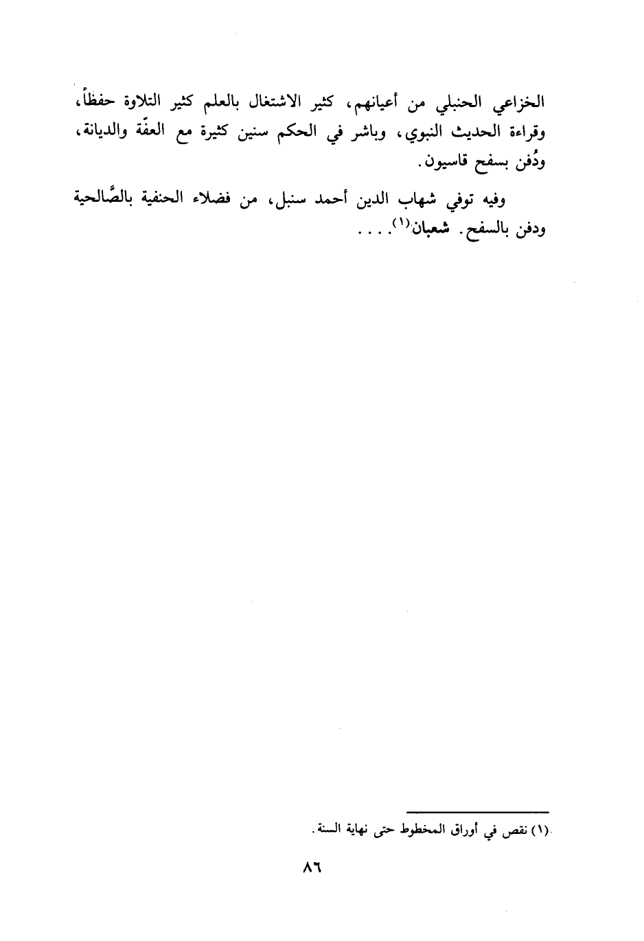 الْخُزَاعِيّ الْحَنْبَلِيّ من أعيانهم كثير الإشتغال بِالْعلمِ كثير التِّلَاوَة حفظا وَقِرَاءَة الحَدِيث النَّبَوِيّ وباشر فِي الحكم سِنِين كَثِيرَة مَعَ الْعِفَّة والديانة وَدفن بسفح قاسيون