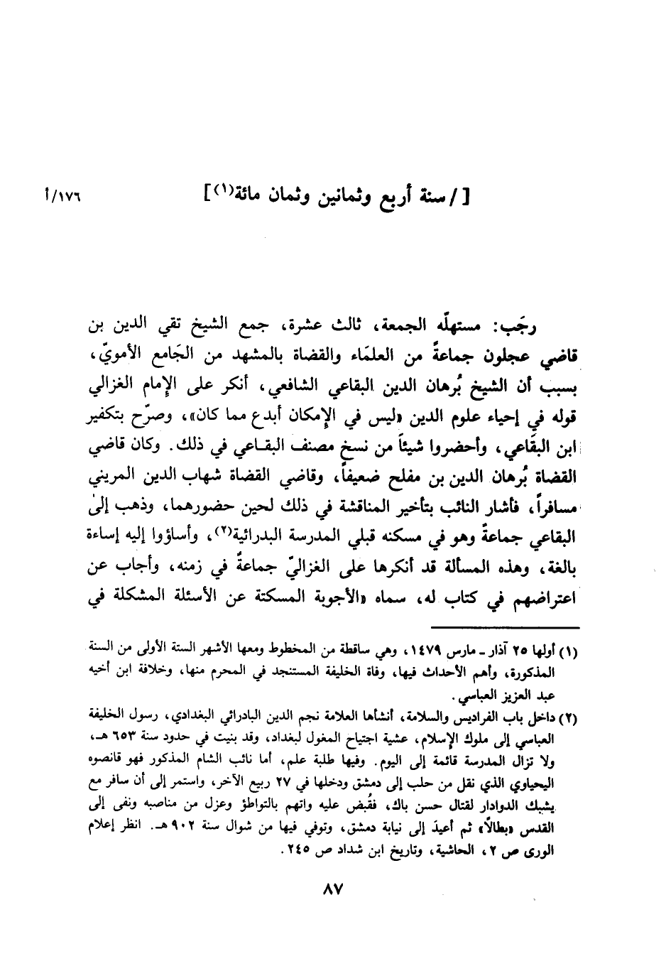 رَجَب مستهله الْجُمُعَة ثَالِث عشرَة جمع الشَّيْخ تَقِيّ الدّين بن قَاضِي عجلون جمَاعَة من الْعلمَاء والقضاة بالمشهد من الْجَامِع الْأمَوِي بِسَبَب أَن الشَّيْخ برهَان الدّين البقاعي الشَّافِعِي أنكر على الإِمَام الْغَزالِيّ قَوْله فِي إحْيَاء عُلُوم الدّين لَيْسَ فِي الْإِمْكَان أبدع مِمَّا كَانَ وَصرح بتكفير ابْن البقاعي وأحضروا شَيْئا من نسخ مُصَنف البقاعي فِي ذَلِك وَكَانَ قَاضِي الْقُضَاة برهَان الدّين بن مُفْلِح ضَعِيفا وقاضي الْقُضَاة شهَاب الدّين المريني مُسَافِرًا فَأَشَارَ النَّائِب بِتَأْخِير المناقشة فِي ذَلِك لحين حضورهما وَذهب إِلَى البقاعي جمَاعَة وَهُوَ فِي مَسْكَنه قبلي الْمدرسَة البدرائية وأساؤوا إِلَيْهِ إساءة بَالِغَة وَهَذِه الْمَسْأَلَة قد أنكرها على الْغَزالِيّ جمَاعَة فِي زَمَنه وَأجَاب عَن إعتراضهم فِي = كتاب لَهُ سَمَّاهُ الْأَجْوِبَة المسكتة عَن الأسئلة المشكلة فِي