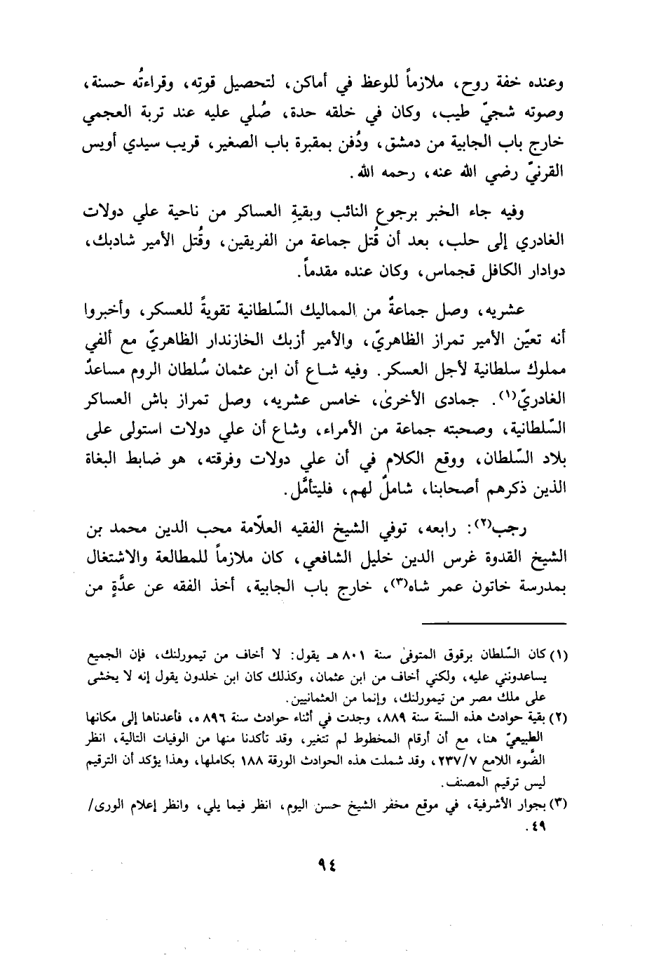 رَجَب رابعه توفّي الشَّيْخ الْفَقِيه الْعَلامَة محب الدّين مُحَمَّد بن الشَّيْخ الْقدْوَة غرس الدّين خَلِيل الشَّافِعِي كَانَ ملازما للمطالعة والإشتغال بمدرسة خاتون عمر شاه خَارج بَاب الْجَابِيَة أَخذ الْفِقْه عَن عدَّة من