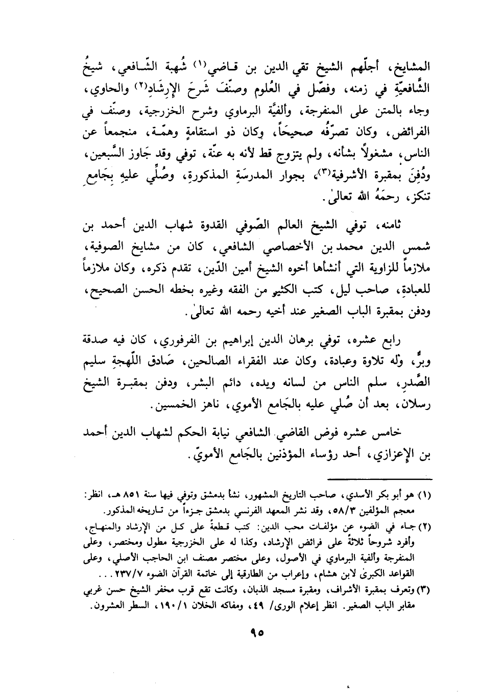 الْمَشَايِخ أَجلهم الشَّيْخ تَقِيّ الدّين بن قَاضِي شُهْبَة الشَّافِعِي شيخ الشَّافِعِيَّة فِي زَمَنه وَفصل فِي الْعُلُوم وصنف شرح الْإِرْشَاد وَالْحَاوِي وَجَاء بِالْمَتْنِ على المنفرجة وألفية الْبرمَاوِيّ وَشرح الخزرجية وصنف فِي الْفَرَائِض وَكَانَ تصرفه صَحِيحا وَكَانَ ذُو إستقامة وهمة منجمعا عَن النَّاس مَشْغُولًا بِشَأْنِهِ وَلم يتَزَوَّج قطّ لِأَنَّهُ بِهِ عنة توفّي وَقد جَاوز السّبْعين وَدفن بمقبرة الأشرفية بجوار الْمدرسَة الْمَذْكُورَة وَصلي عَلَيْهِ بِجَامِع تنكز رَحمَه الله تَعَالَى