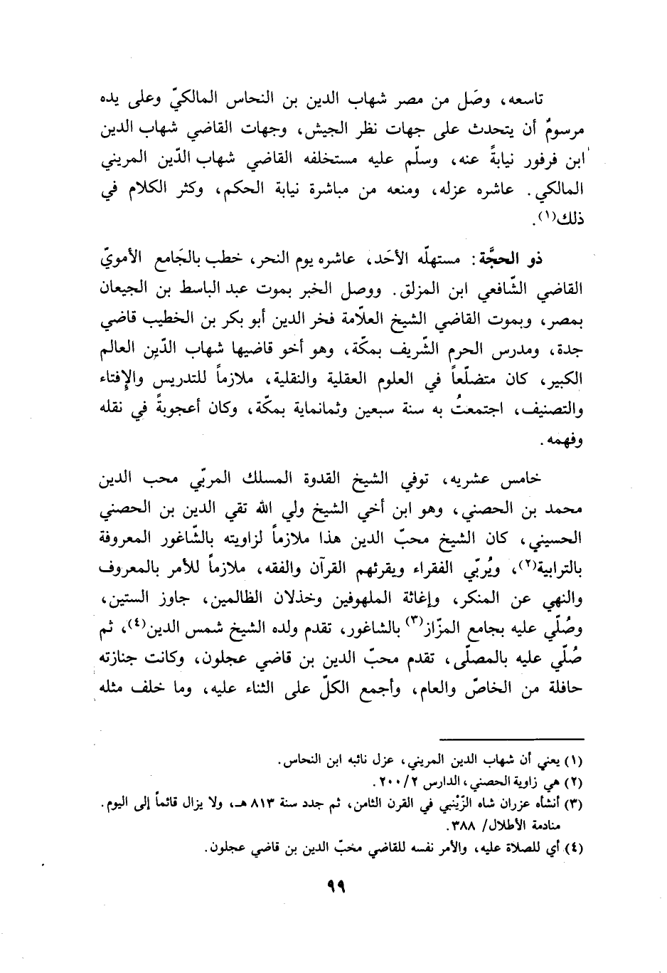 تاسعه وصل من مصر شهَاب الدّين بن النّحاس الْمَالِكِي وعَلى يَده مرسوم أَن يتحدث على جِهَات نظر الْجَيْش وجهات القَاضِي شهَاب الدّين ابْن فرفور نِيَابَة عَنهُ وَسلم عَلَيْهِ مستخلفه القَاضِي شهَاب الدّين المريني الْمَالِكِي عاشره عَزله وَمنعه من مُبَاشرَة نِيَابَة الحكم وَكثر الْكَلَام فِي ذَلِك