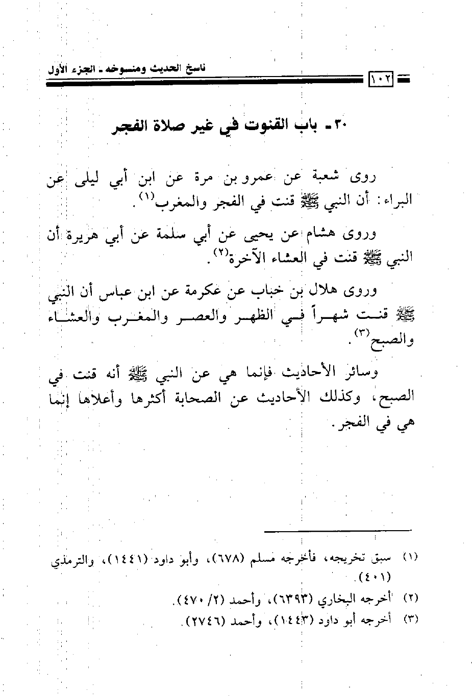 روى شعبة عن عمرو بن مرة عن ابن أبي ليلى عن البراء: أن النبي صلى الله عليه وسلم قنت في الفجر والمغرب.