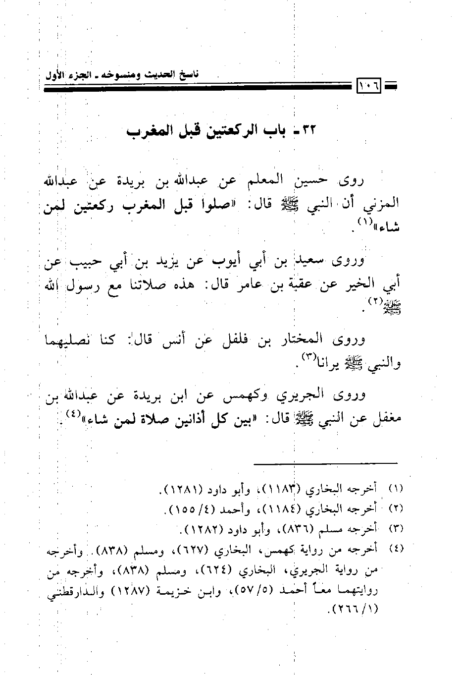 روى حسين المعلم عن عبد الله بن بريدة عن عبد الله المزني أن النبي صلى الله عليه وسلم قال: ((صلوا قبل المغرب ركعتين لمن شاء)).