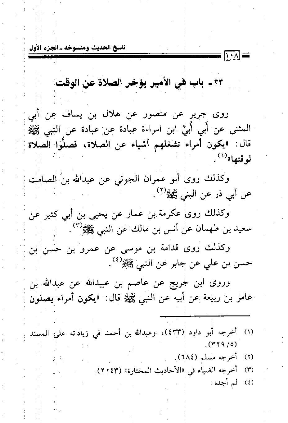 روى جرير عن منصور عن هلال بن يساف عن أبي المثنى عن أَبي أُبي ابن امرأة عبادة عن عبادة عن النبي صلى الله عليه وسلم قال: ((يكون أمراء تشغلهم أشياء عن الصلاة، فصلوا الصلاة لوقتها)).