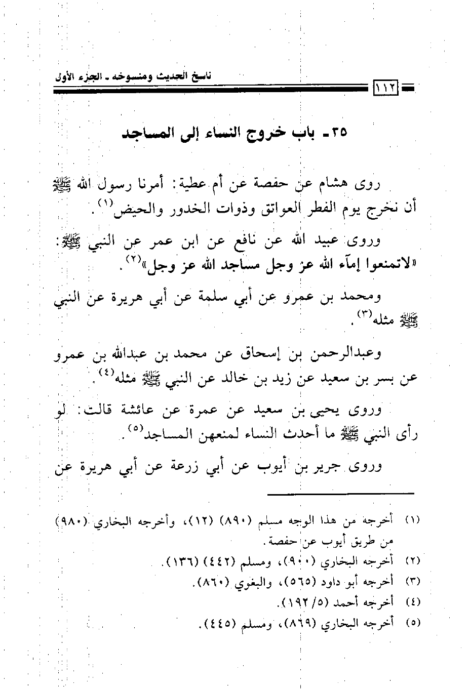 وروى عبيد الله عن نافع عن ابن عمر عن النبي صلى الله عليه وسلم: ((لا تمنعوا إماء الله عز وجل مساجد الله عز وجل)).