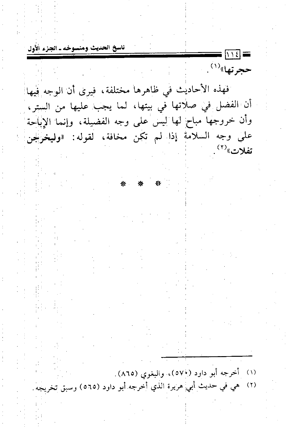 فهذه الأحاديث في ظاهرها مختلفة، فيرى أن الوجه فيها أن الفضل في صلاتها في بيتها، لما يجب عليها من الستر، وأن خروجها مباح لها ليس على وجه الفضيلة، وإنما الإباحة على وجه السلامة إذا لم تكن مخافة، لقوله: ((وليخرجن تفلات)).