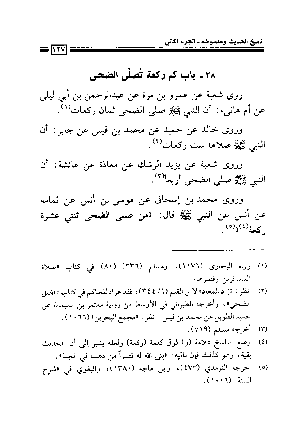 روى شعبة عن عمرو بن مرة عن عبد الرحمن بن أبي ليلى عن أم هانئ: أن النبي صلى الله عليه وسلم صلى الضحى ثمان ركعات.
