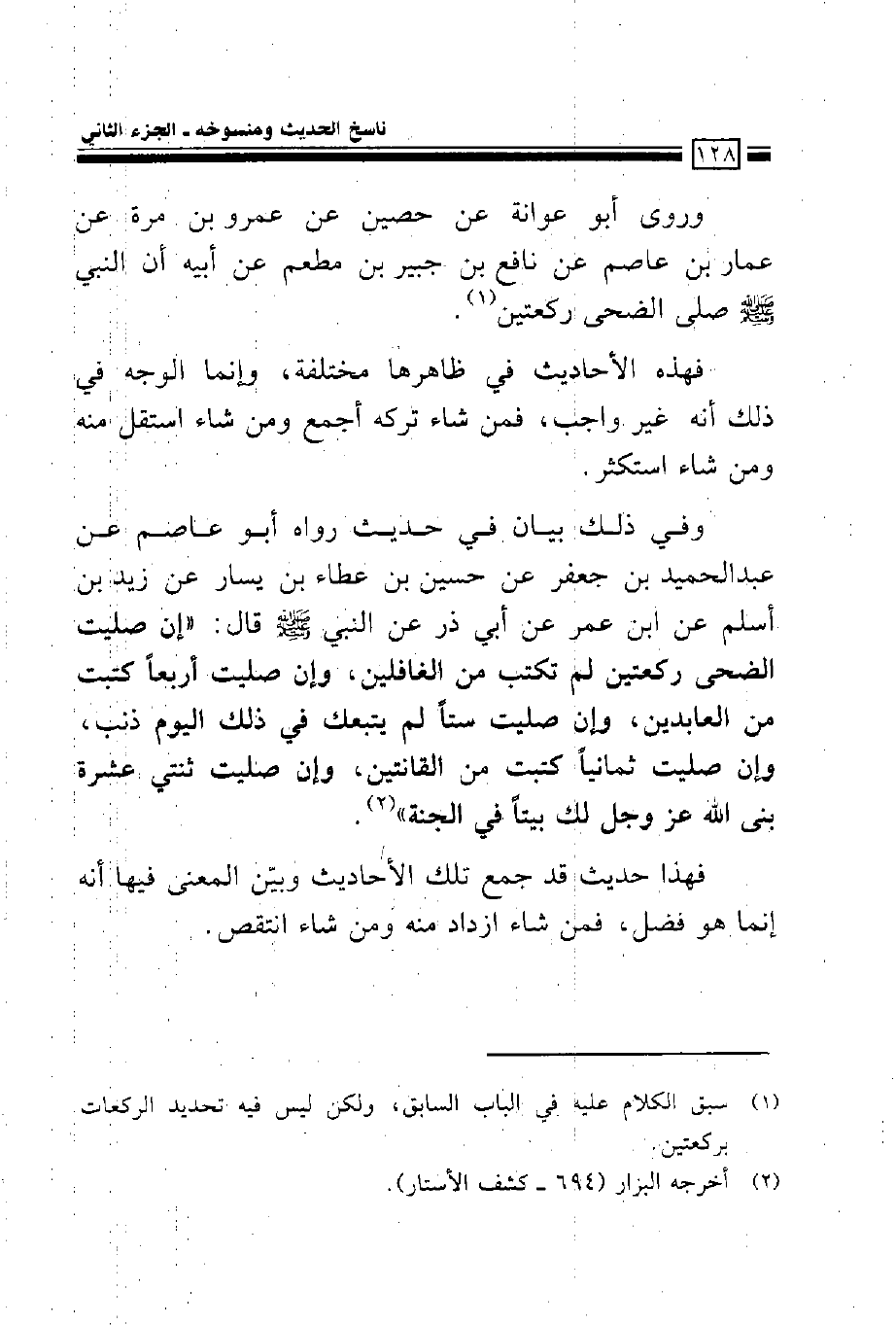 وروى أبو عوانة عن حصين عن عمرو بن مرة عن عمار بن عاصم عن نافع بن جبير بن مطعم عن أبيه أن النبي صلى الله عليه وسلم صلى الضحى ركعتين.