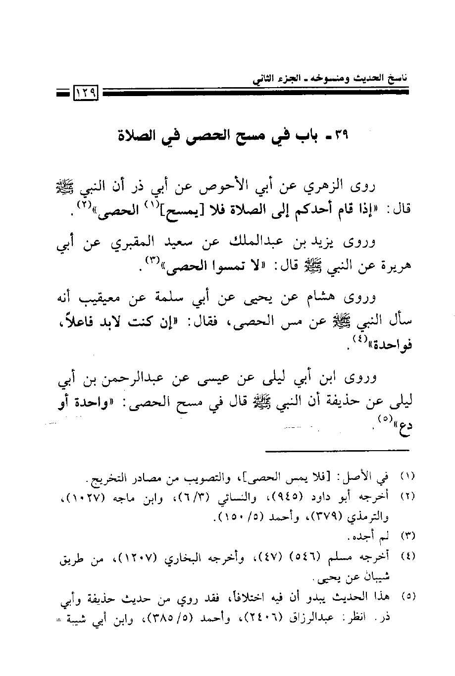 روى الزهري عن أبي الأحوص عن أبي ذر أن النبي صلى الله عليه وسلم قال: ((إذا قام أحدكم إلى الصلاة فلا [يمسح] الحصى)).