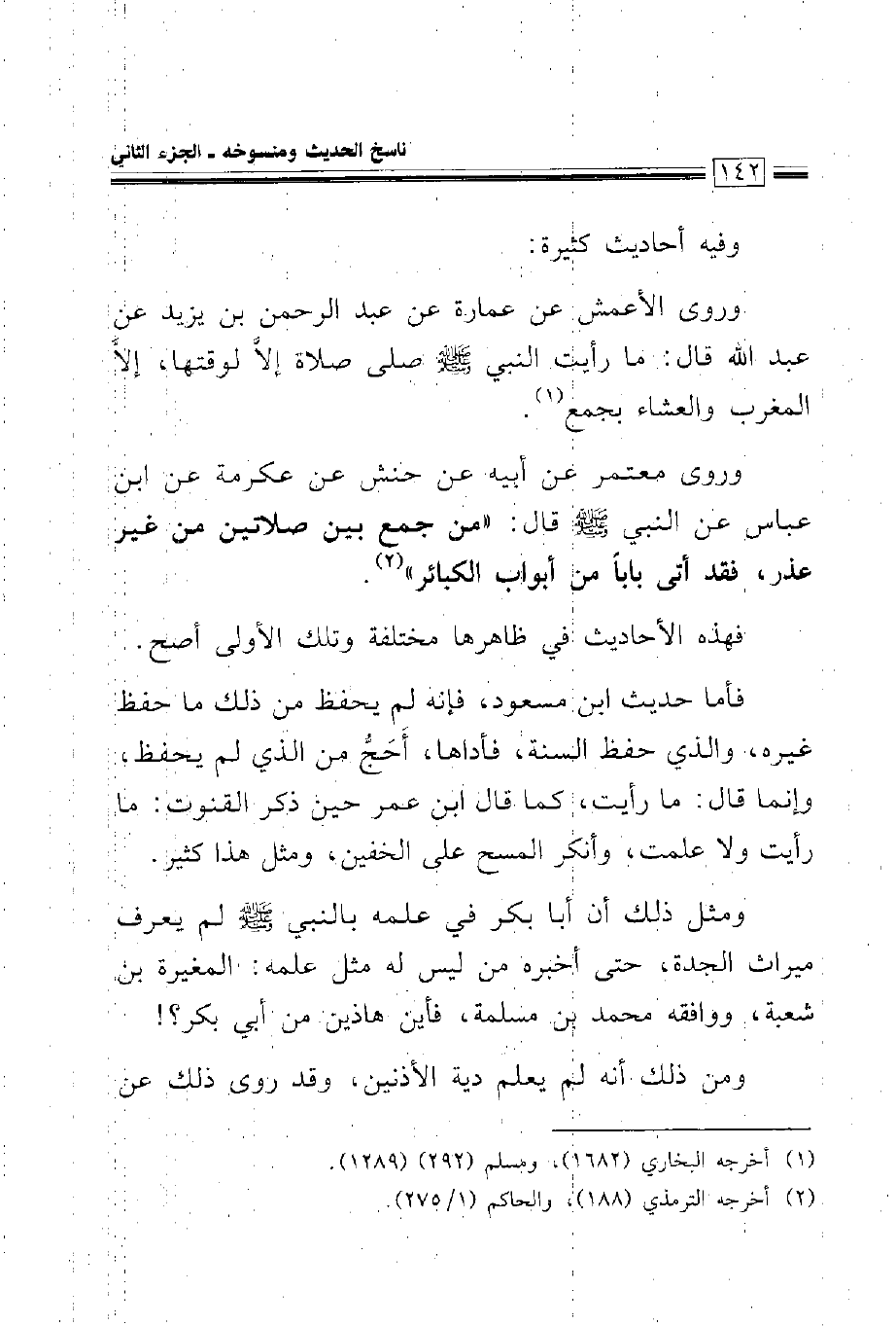 وروى معتمر عن أبيه عن حنش عن عكرمة عن ابن عباس عن النبي صلى الله عليه وسلم قال: ((من جمع بين صلاتين من غير عذر، فقد أتى باباً من أبواب الكبائر)).