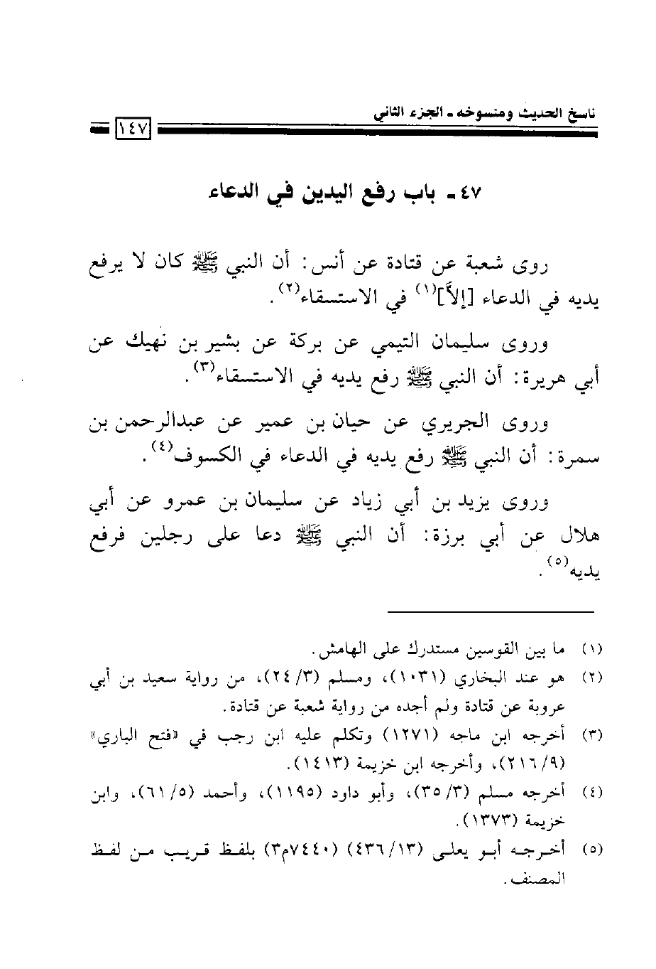 روى شعبة عن قتادة عن أنس: أن النبي صلى الله عليه وسلم كان لا يرفع يديه في الدعاء [إلا] في الاستسقاء.