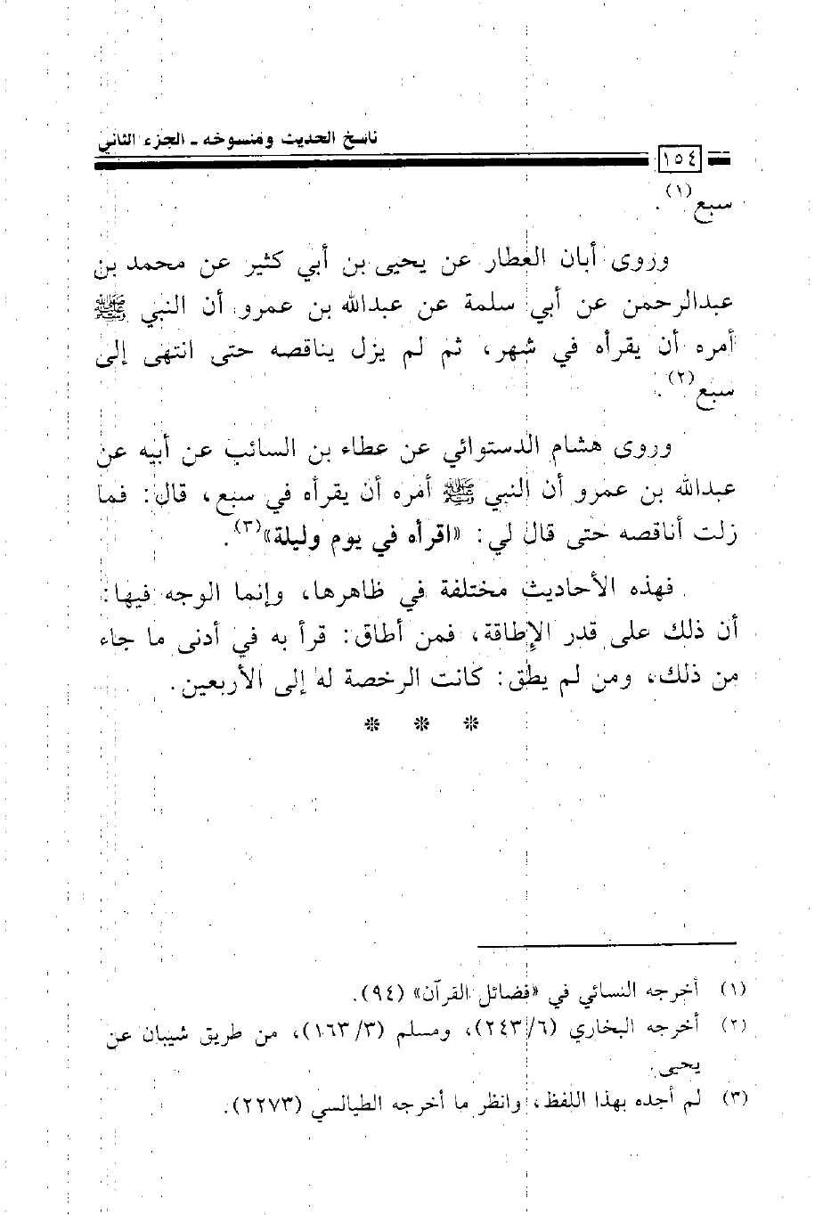 وروى هشام الدستوائي عن عطاء بن السائب عن أبيه عن عبد الله بن عمرو أن النبي صلى الله عليه وسلم أمره أن يقرأه في سبع، قال: فما زلت أناقصه حتى قال لي: ((اقرأه في يوم وليلة)).