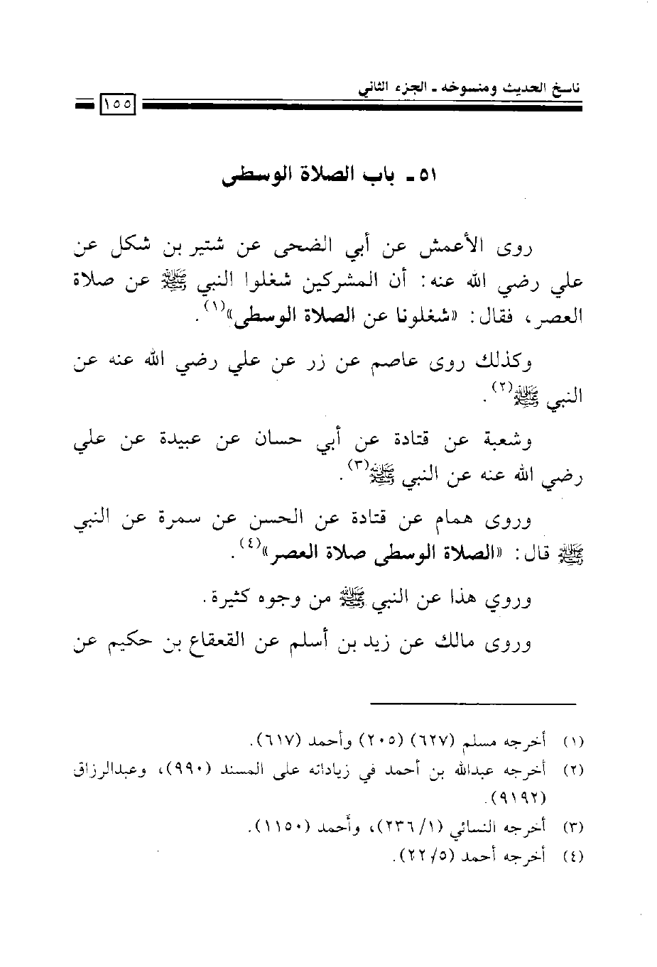 روى الأعمش عن أبي الضحى عن شتير بن شكل عن علي رضي الله عنه: أن المشركين شغلوا النبي صلى الله عليه وسلم عن صلاة العصر، قال: ((شغلونا عن الصلاة الوسطى)).