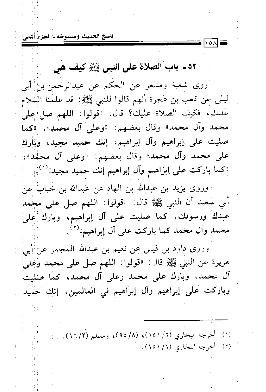 روى شعبة ومسعر عن الحكم عن عبد الرحمن بن أبي ليلى عن كعب بن عجرة أنهم قالوا للنبي صلى الله عليه وسلم: قد علمنا السلام عليك، فكيف الصلاة عليك؟ قال: ((قولوا: اللهم صل على محمد وآل محمد)) وقال بعضهم: ((وعلى آل محمد))، ((كما صليت على إبراهيم وآل إبراهيم، إنك حميد مجيد، وبارك على محمد وآل محمد)) وقال بعضهم: ((وعلى آل محمد))، ((كما باركت على إبراهيم وآل إبراهيم إنك حميد مجيد)).