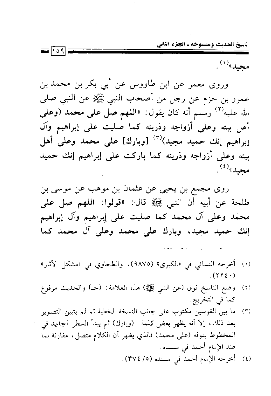 وروى معمر عن ابن طاووس عن أبي بكر بن محمد بن عمرو بن حزم عن رجل من أصحاب النبي صلى الله عليه وسلم عن النبي صلى الله عليه وسلم أنه كان يقول: ((اللهم صل على محمد (وعلى أهل بيته وعلى أزواجه وذريته كما صليت على إبراهيم وآل إبراهيم إنك حميد مجيد [وبارك] على محمد وعلى أهل بيته وعلى أزواجه وذريته كما باركت على إبراهيم إنك حميد مجيد)).