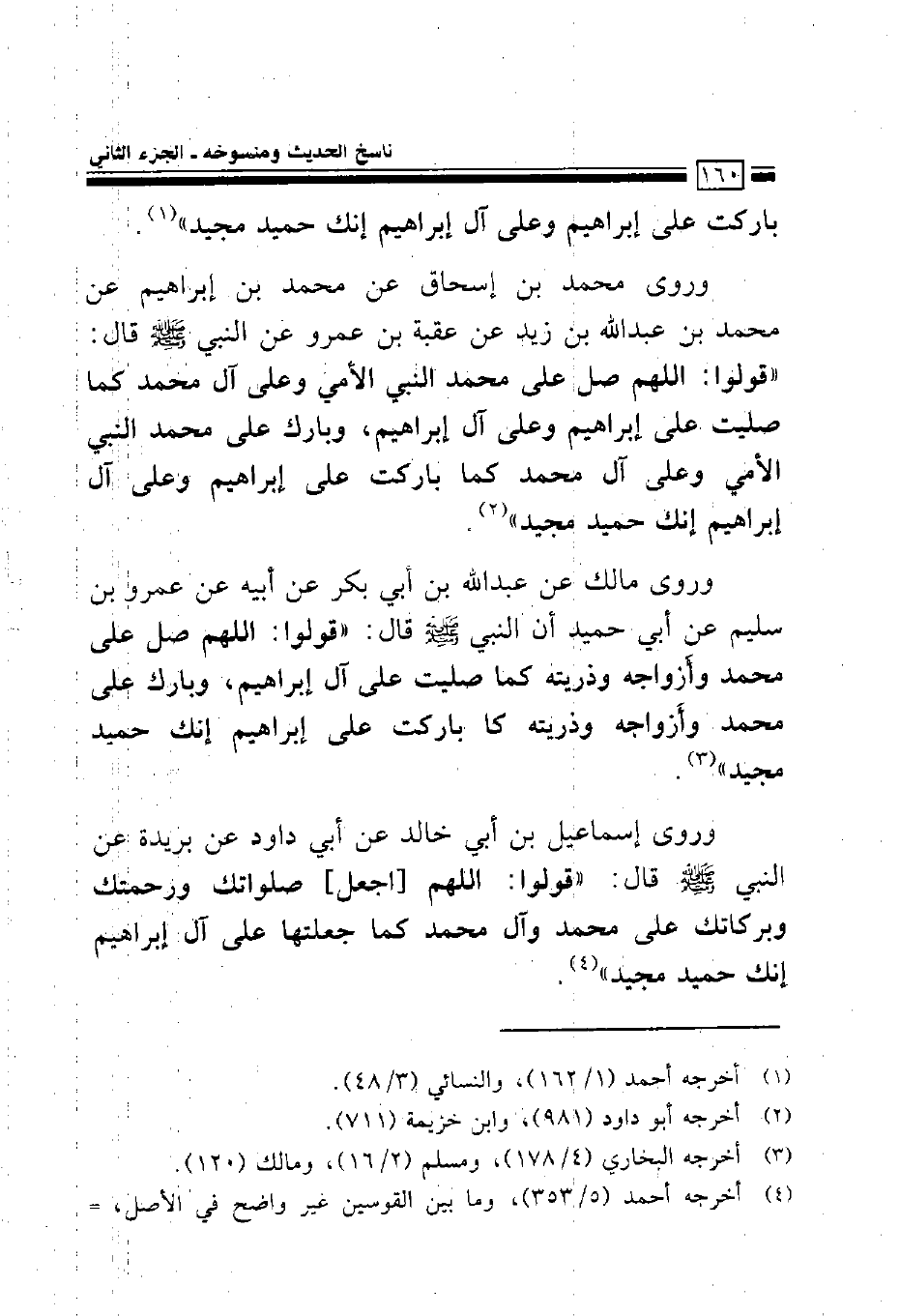 وروى محمد بن إسحاق عن محمد بن إبراهيم عن محمد بن عبد الله بن زيد عن عقبة بن عمرو عن النبي صلى الله عليه وسلم قال: ((قولوا: اللهم صل على محمد النبي الأمي وعلى آل محمد كما صليت على إبراهيم وعلى آل إبراهيم، وبارك على محمد النبي الأمي وعلى آل محمد كما باركت على إبراهيم وعلى آل إبراهيم إنك حميد مجيد)).