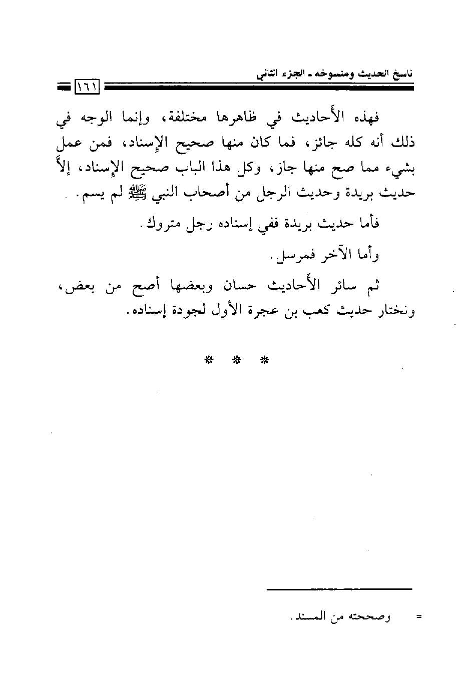 فهذه الأحاديث في ظاهرها مختلفة، وإنما الوجه في ذلك أنه كله جائز، فما كان منها صحيح الإسناد، فمن عمل بشيء مما صح منها جاز، وكل هذا الباب صحيح الإسناد، إلا حديث بريدة وحديث الرجل من أصحاب النبي صلى الله عليه وسلم لم يسم.