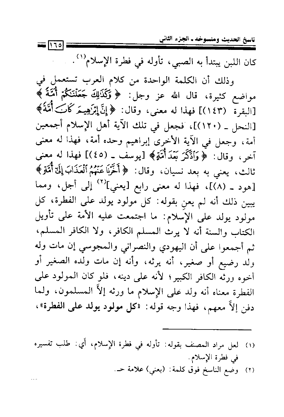 وذلك أن الكلمة الواحدة من كلام العرب تستعمل في مواضع كثيرة، قال الله عز وجل: {وكذلك جعلناكم أمةً} فهذا له معنى، وقال: {إن إبراهيم كان أمةً}، فجعل في تلك الآية أهل الإسلام أجمعين أمة، وجعل في الآية الأخرى إبراهيم وحده أمة، فهذا له معنى آخر، وقال: {واذكر بعد أمةٍ} فهذا له معنى ثالث، يعني به بعد نسيان، وقال: {أخرنا عنهم العذاب إلى أمةٍ}، فهذا له معنى رابع [يعني] إلى أجل، ومما يبين ذلك أنه لم يعن بقوله: كل مولود يولد على الفطرة، كل مولود يولد على الإسلام: ما اجتمعت عليه الأمة على تأويل الكتاب والسنة أنه لا يرث المسلم الكافر، ولا الكافر المسلم، ثم أجمعوا على أن اليهودي والنصراني والمجوسي إن مات وله ولد رضيع أو صغير، أنه يرثه، وأنه إن مات ولده الصغير أو أخوه ورثه الكافر الكبير؛ لأنه على دينه، فلو كان المولود على الفطرة معناه أنه ولد على الإسلام ما ورثه إلا المسلمون، ولما دفن إلا معهم، فهذا وجه قوله: ((كل مولود يولد على الفطرة))،