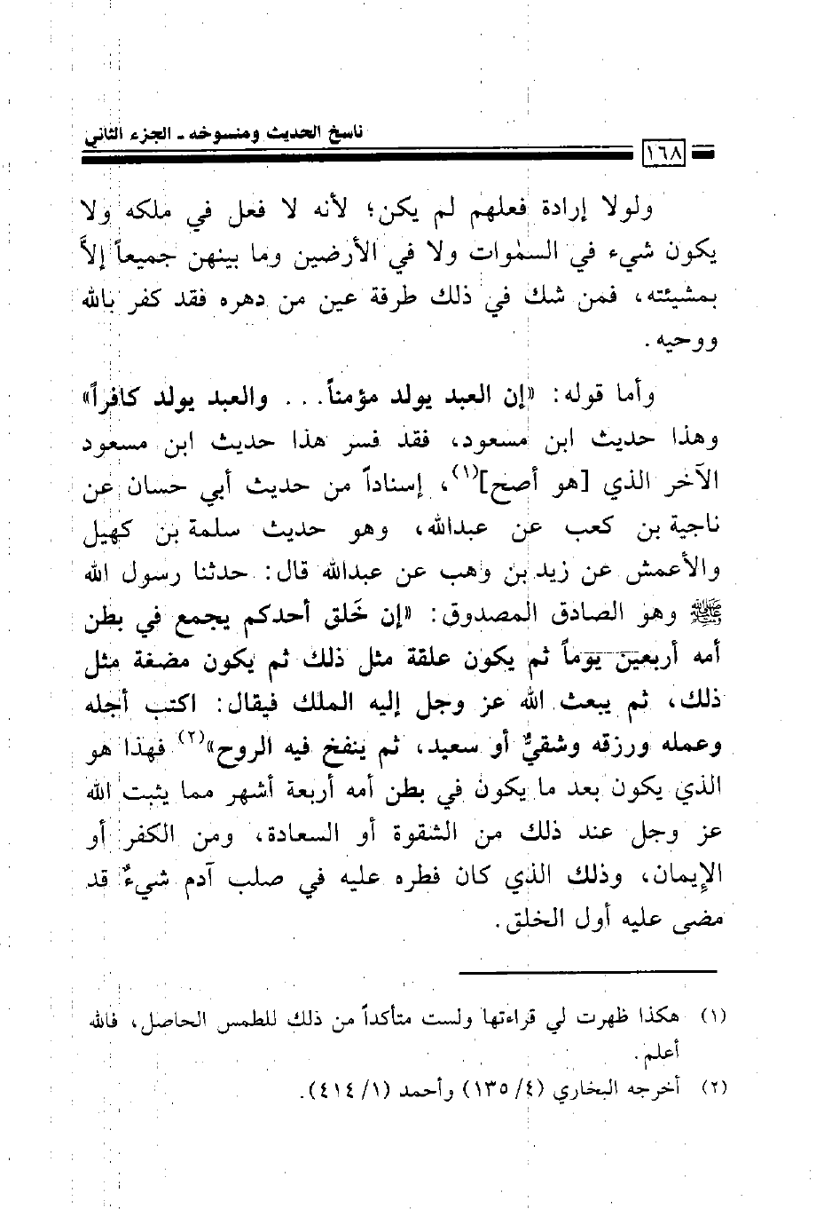 وأما قوله: ((إن العبد يولد مؤمناً .. .. والعبد يولد كافراً)). وهذا حديث ابن مسعود، فقد فسر هذا حديث ابن مسعود الآخر الذي [هو أصح]، إسناداً من حديث أبي حسان عن ناجية بن كعب عن عبد الله، وهو حديث سلمة بن كهيل والأعمش عن يزيد بن وهب عن عبد الله قال: حدثنا رسول الله صلى الله عليه وسلم وهو الصادق المصدوق: ((إن خلق أحدكم يجمع في بطن أمه أربعين يوماً ثم يكون علقة مثل ذلك ثم يكون مضغة مثل ذلك، ثم يبعث الله عز وجل إليه الملك فيقال: اكتب أجله وعمله ورزقه وشقيٌّ أو سعيد، ثم ينفخ فيه الروح)) فهذا هو الذي يكون بعد ما يكون في بطن أمه أربعة أشهر مما يثبت الله عز وجل عند ذلك من الشقوة أو السعادة، ومن الكفر أو الإيمان، وذلك الذي كان فطره عليه في صلب آدم شيءٌ فقد مضى عليه أول الخلق.