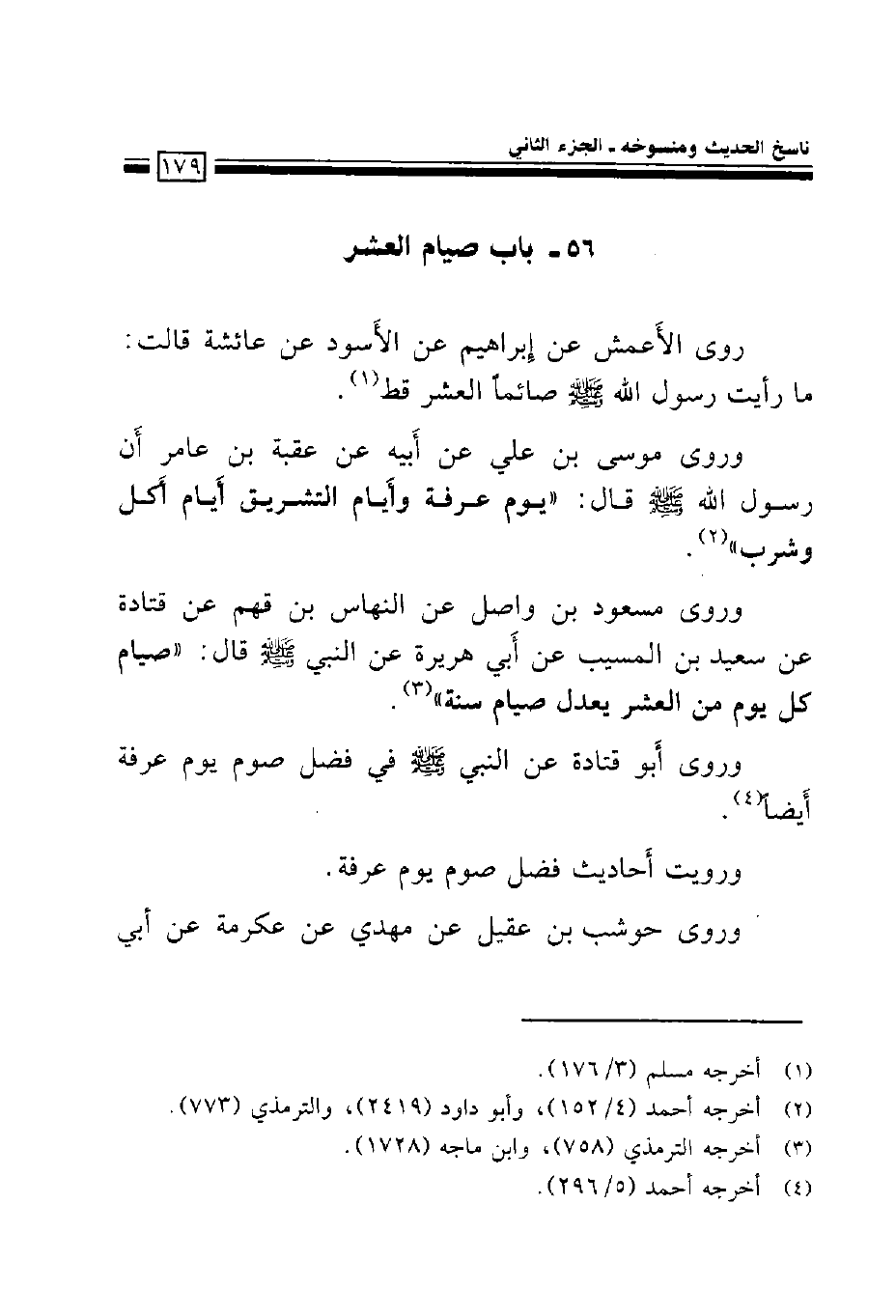 وروى مسعود بن واصل عن النهاس بن قهم عن قتادة عن سعيد بن المسيب عن أبي هريرة عن النبي صلى الله عليه وسلم قال: ((صيام كل يوم من العشر يعدل صيام سنة)).