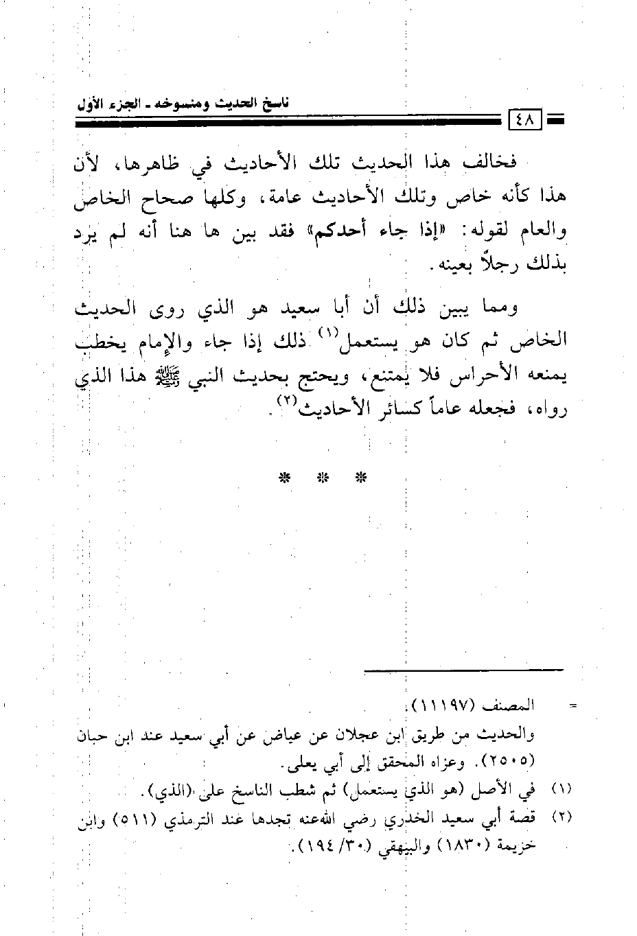 ومما يبين ذلك أن أبا سعيد هو الذي روى الحديث الخاص ثم كان هو يستعمل ذلك إذا جاء والإمام يخطب يمنعه الأحراس فلا يمتنع، ويحتج بحديث النبي صلى الله عليه وسلم هذا الذي رواه، فجعله عاماً كسائر الأحاديث.