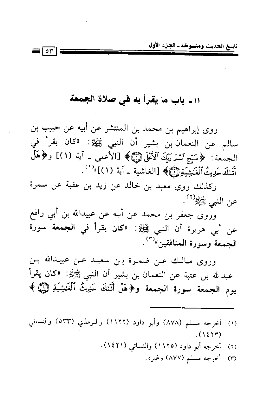 روى إبراهيم بن محمد بن المنتشر عن أبيه عن حبيب بن سالم عن النعمان بن بشير أن النبي صلى الله عليه وسلم: ((كان يقرأ في الجمعة: {سبح اسم ربك الأعلى} و {هل أتاك حديث الغاشية})).