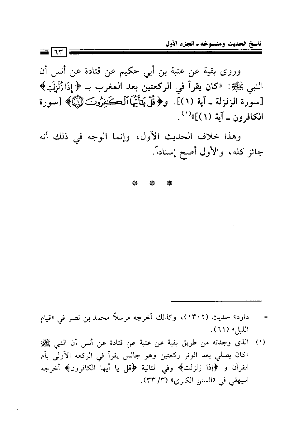 وروى بقية عن عتبة بن أبي حكيم عن قتادة عن أنس أن النبي صلى الله عليه وسلم: ((كان يقرأ في الركعتين بعد المغرب بـ {إذا زلزلت}. و {قل يا أيها الكافرون})).