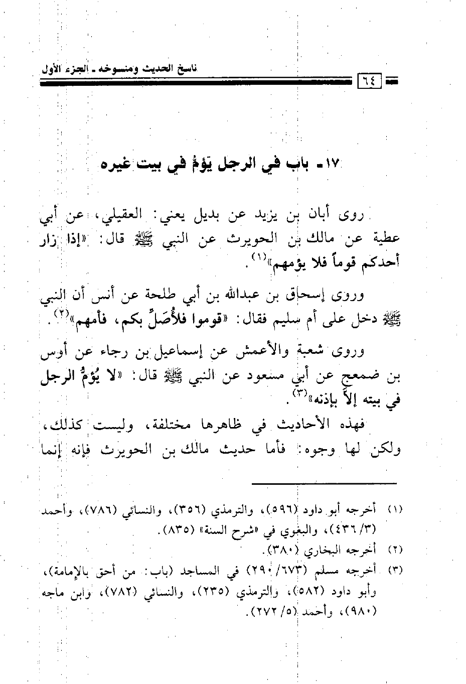 وروى شعبة والأعمش عن إسماعيل بن رجاء عن أوس بن ضمعج عن أبي مسعود عن النبي صلى الله عليه وسلم قال: ((لا يؤم الرجل في بيته إلا بإذنه)).