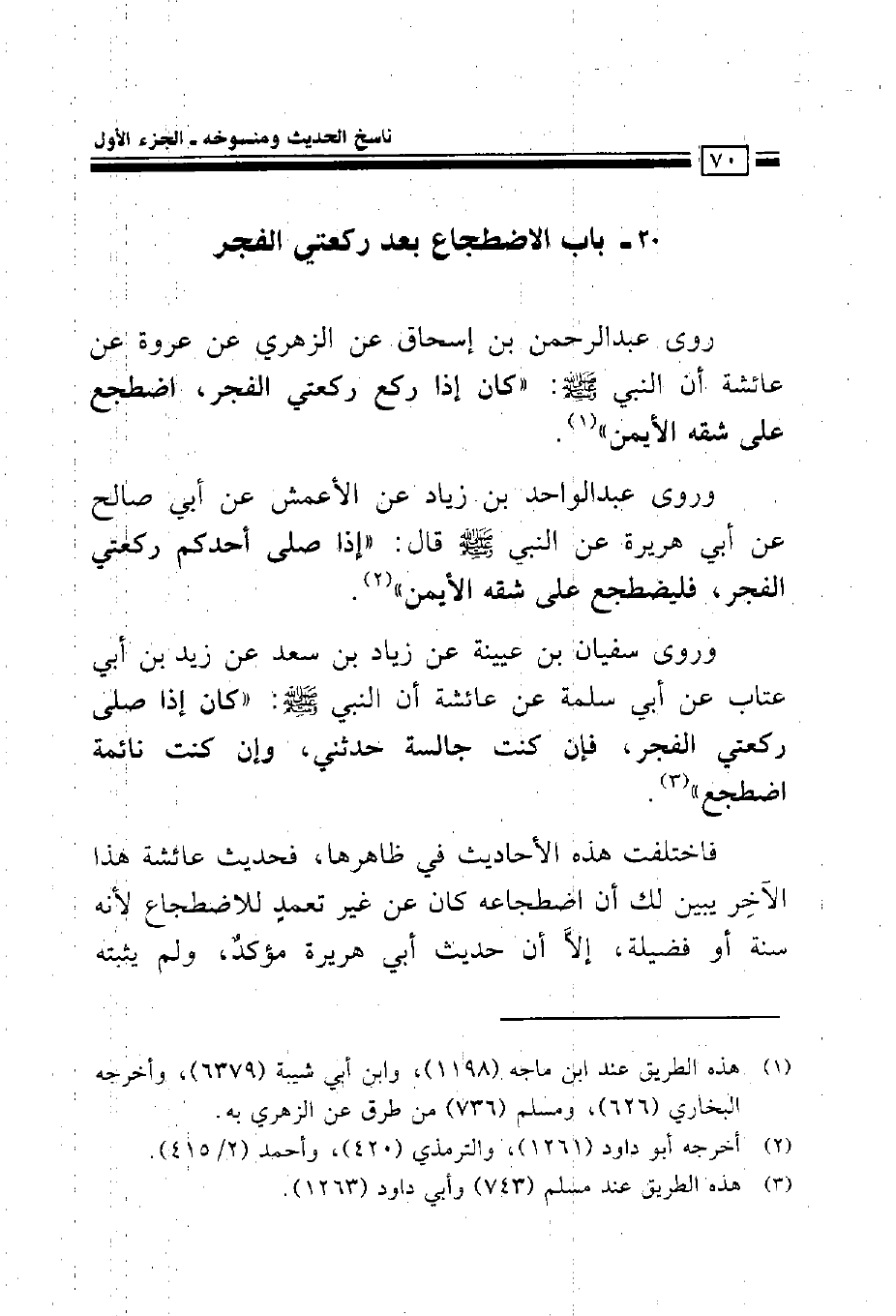 فاختلفت هذه الأحاديث في ظاهرها، فحديث عائشة هذا الآخر يبين لك أن اضطجاعه كان عن غير تعمدٍ للاضطجاع لأنه سنة أو فضيلة، إلا أن حديث أبي هريرة مؤكدٌ، ولم يثبته