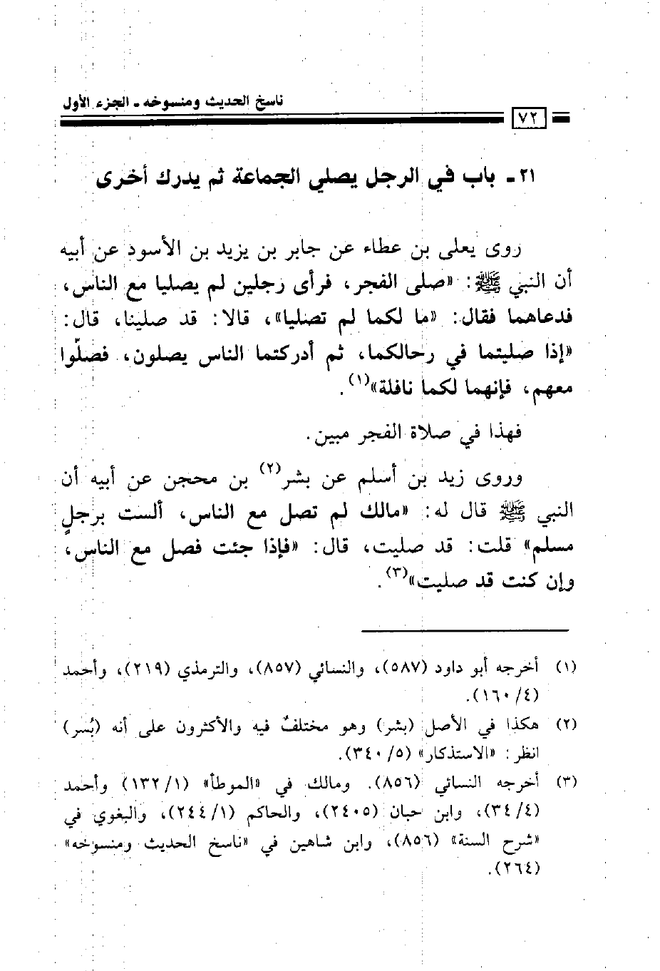 روى يعلى بن عطاء عن جابر بن يزيد بن الأسود عن أبيه أن النبي صلى الله عليه وسلم: ((صلى الفجر، فرأى رجلين لم يصليا مع الناس، فدعاهما فقال: ((ما لكما لم تصليا))، قالا: قد صلينا، قال: ((إذا صليتما في رحالكما، ثم أدركتما الناس يصلون، فصلوا معهم، فإنهما لكما نافلة)).