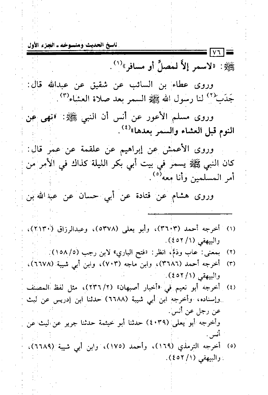 صلى الله عليه وسلم: ((لا سمر إلا لمصل أو مسافر)).